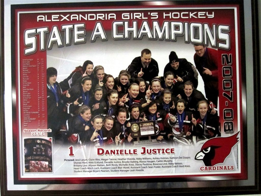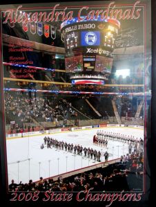 You’ve probably been wondering about the background photo to this blog? Well, here it is. (The letterhead photo is just of some old guy standing in the middle of beautiful Lake Darling and hoping the ice doesn’t break.) It is of the all-tournament team from the 2008 Girls’ State Hockey Tournament, won by the Cardinals. The Alex girls (in black) are, from l – r, Kat DelZoppo, Danielle Justice, Ashley Holmes, Michelle Anez, and Abby Williams. They are also, in every sense, the background for this blog. We started following them when they were 8th-graders in 2003. Their fan base of retirees grew into a group called the Super Fans. And the Super Fans prided ourselves in anticipating what would become a state championship team in their senior years. This is the first archival recollection for this blog – the storylines leading to that championship: