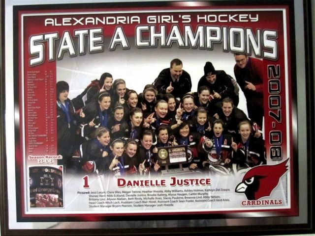 Beating Roseau and Breck proved the Cardinals worthiness – they were the two best teams we played all season, and we ended with a 3-0-1 record in the four games against them. The Cards played Roseau to a 1-1 tie at home earlier this year, and beat Breck 2-0 at their arena just before Christmas. In the semi-final, Roseau scored in the 1st period and held that 1-0 lead into the 3rd period – the Cardinals then got two power-play goals from Abby Williams and Michelle Anez and hung on for the win. The Super Fans were all of the opinion it was the best game we’d seen since the double OT win against Totino-Grace in the section finals two years ago. The championship game against Breck was almost identical in terms of the play – except this time the Cards scored first. Kat DelZoppo and Michelle Anez scored in the 2nd period, and Breck scored in the 3rd to get within one goal. Of course, Breck pulled their goalie at the end to try to tie the game, and the Cardinal fans didn’t start breathing again until the final whistle finally blew. The common thread through all three wins in the tournament was the superstar play of goalie Danielle “Roadblock” Justice – she had 97 saves in the three games. The Breck coach said before the game there would be little scoring (Breck beat Austin in their semi-final 12-1, without taking a shot on goal in the third period!) – and after the game he said Danielle was the best goalie they faced all year. If there had to be one downer in an otherwise perfect weekend, it was that Danielle was not named Ms. Minnesota Goalie. Those of us who have watched her play the last three years know she’s the best – she is THE Ms. Minnesota Goalie.