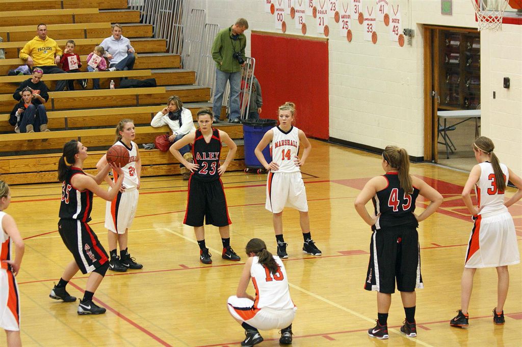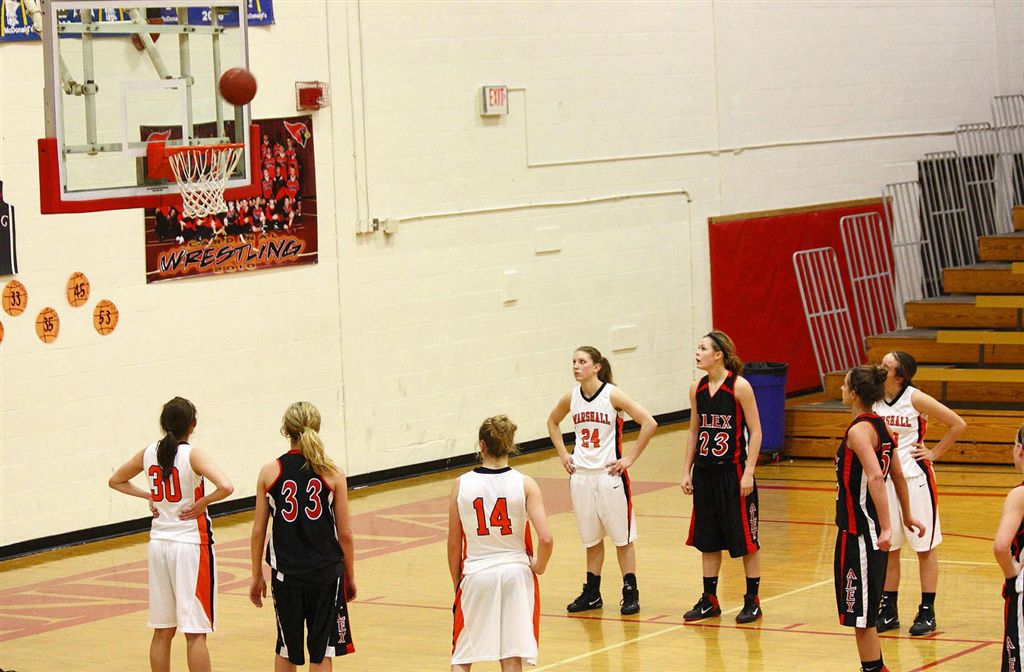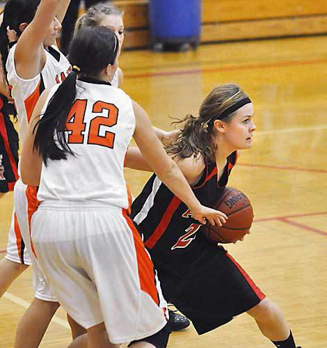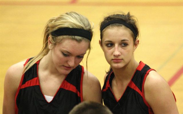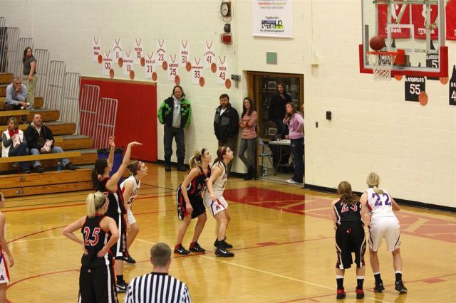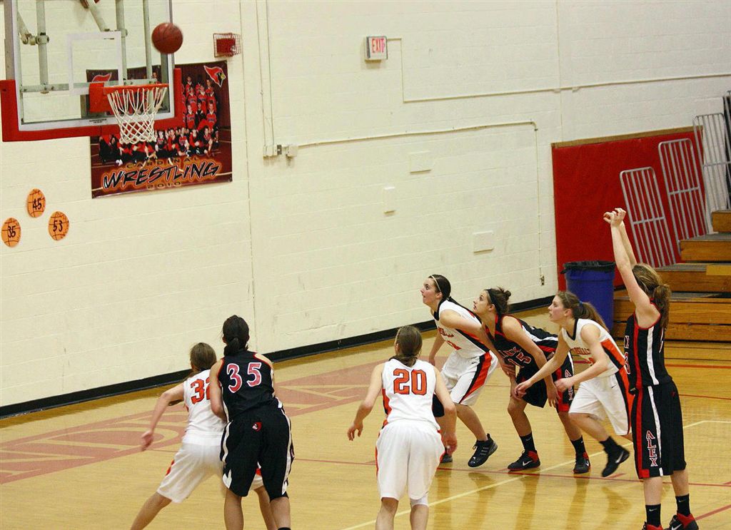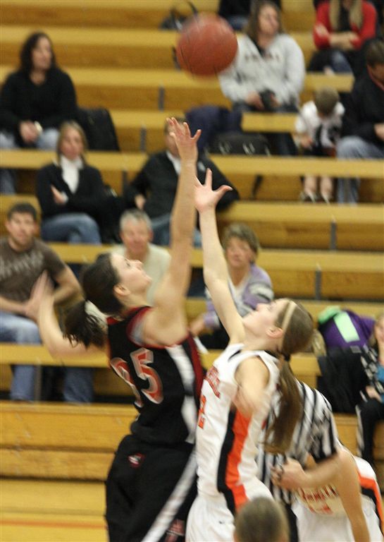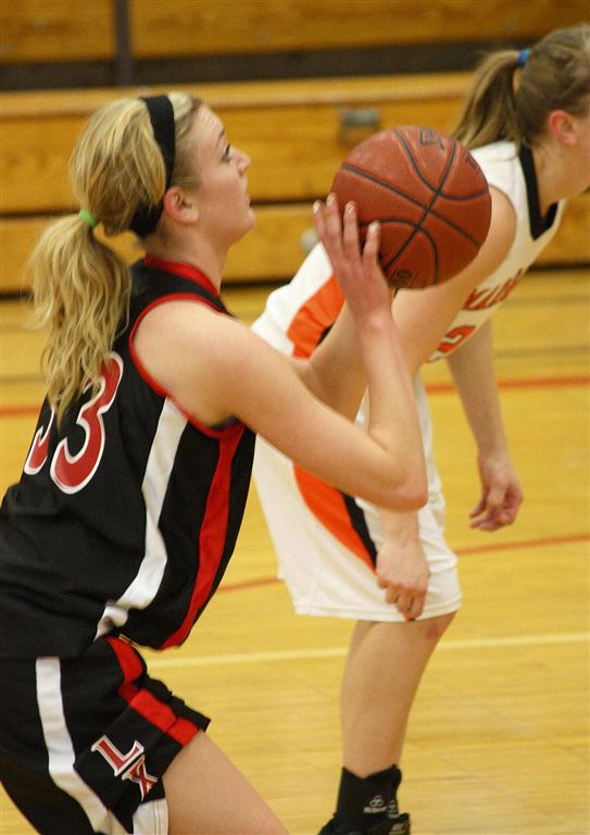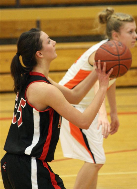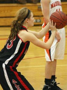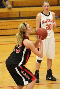 Joie Warnes (No. 23), 5’10” senior, has come of age as a starter, terrific all-around athlete in track, soccer, and basketball, fits the team MO as a quick, aggressive defender, and has that nice baseline jumper [Echo photo left]:
