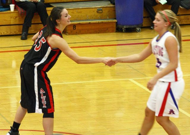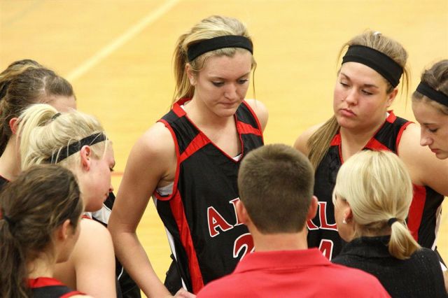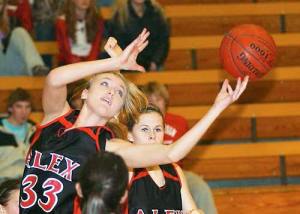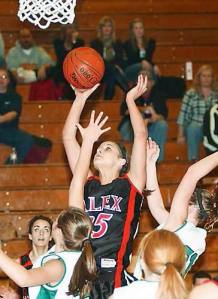 Whitney Gesell (No. 33), 6’1” junior, what an asset to have a tall, athletic player to be first off the bench, a good shooter and rebounder, and able to fill-in at all the front court positions [left photo from Echo]:
