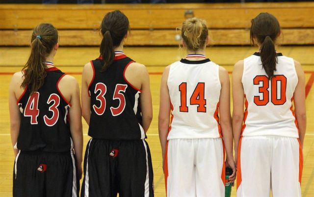 First up, Sam Trumm (No. 35), 6’1” senior, Lauren’s (No. 43) big sister, also all-star caliber volleyball player, and the center who I believe has won all her center jumps so far. The rebounder who can also get out and run the break:
