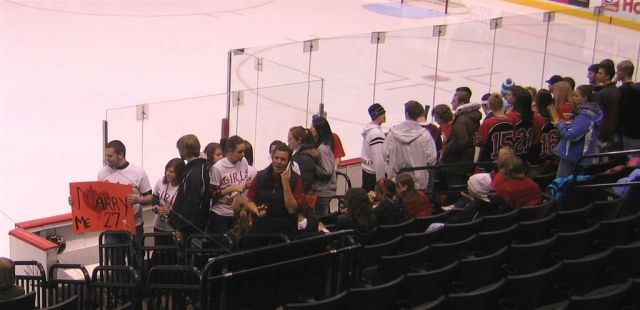 [Team warms up at “X,” Kat DelZoppo is the object of the “Marry me 27” sign]