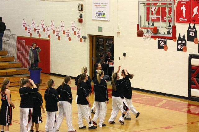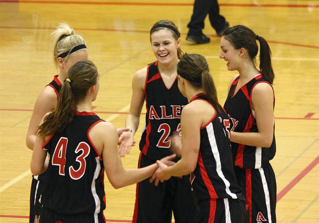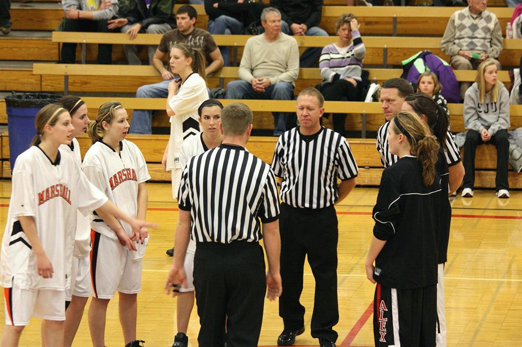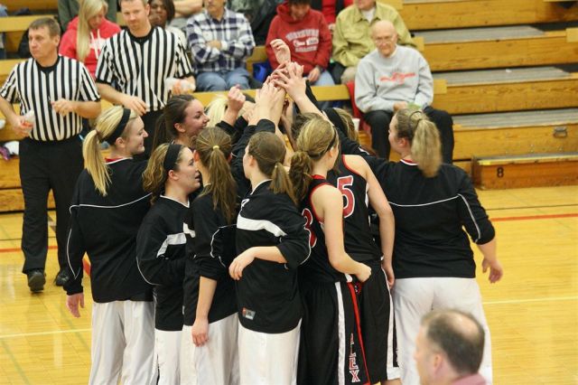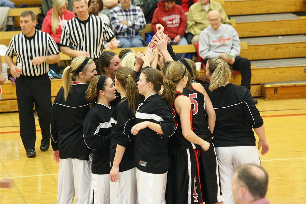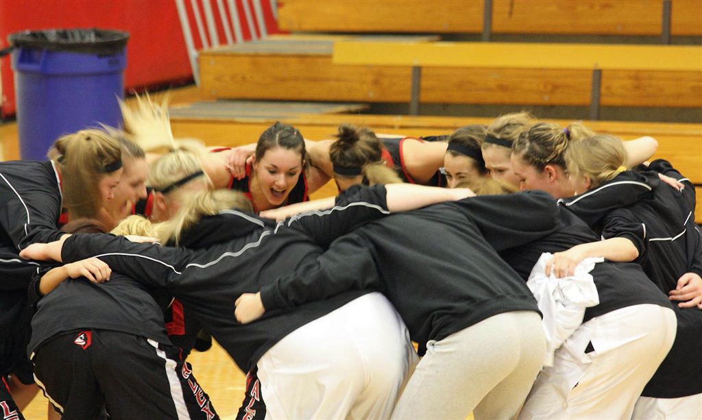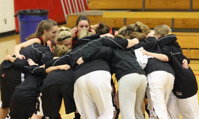 [The starters gather on court prior to the opening tip apparently to encourage one another. I found the one of the Trumm sisters laughing heartily particularly (is that like a double adverb?) delightful – and wonder if Alli had just relayed an “Ole and Lena” joke?]