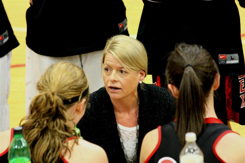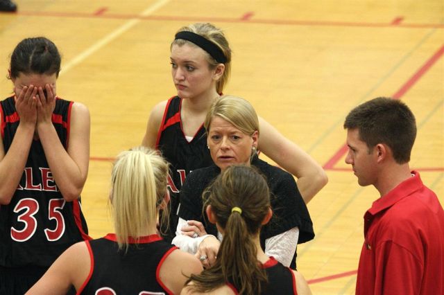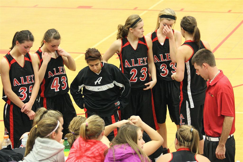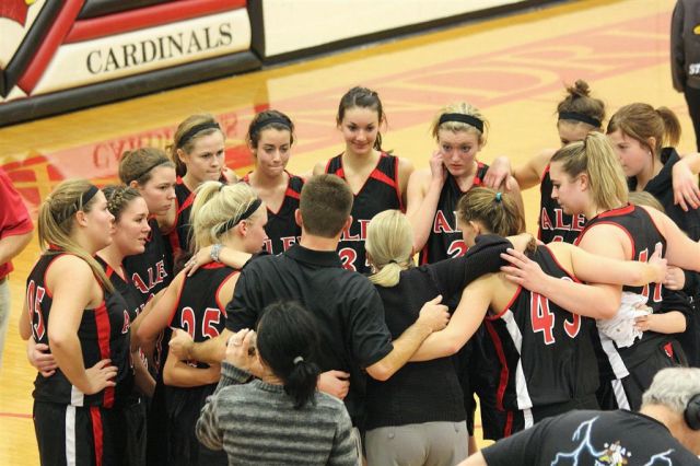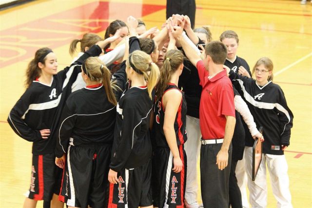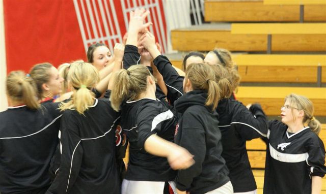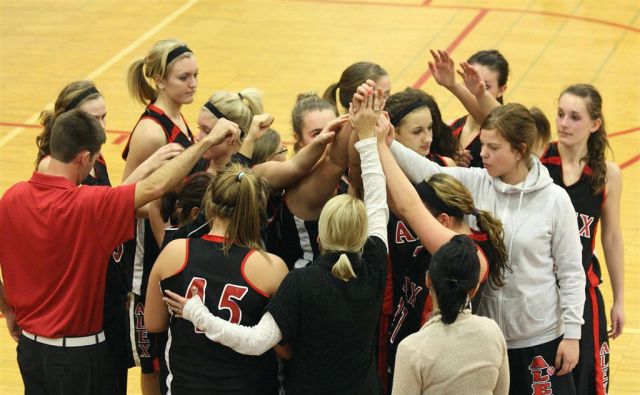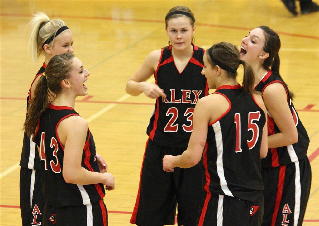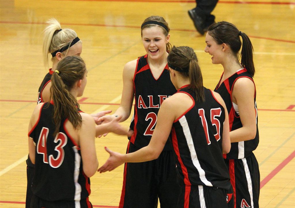 [The starters gather on court prior to the opening tip apparently to encourage one another. I found the one of the Trumm sisters laughing heartily particularly (is that like a double adverb?) delightful – and wonder if Alli had just relayed an “Ole and Lena” joke?]