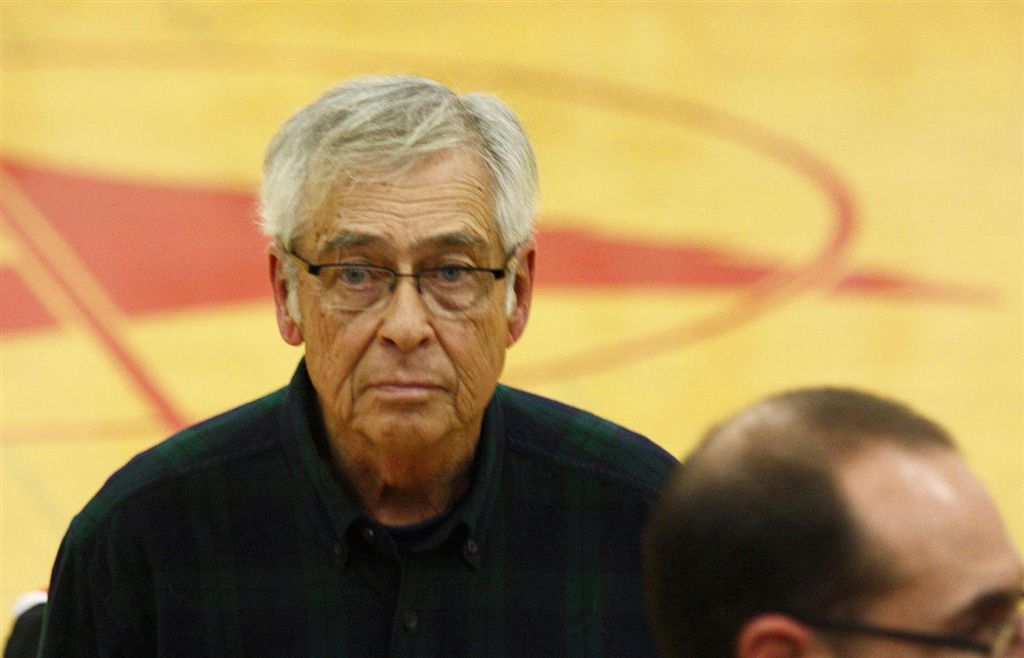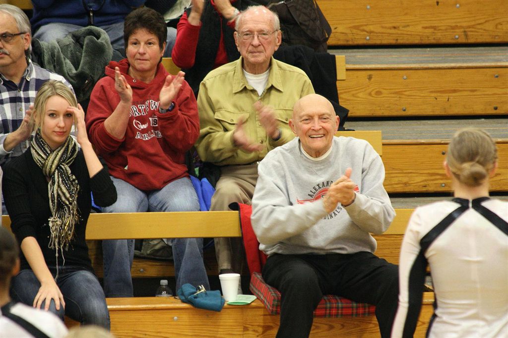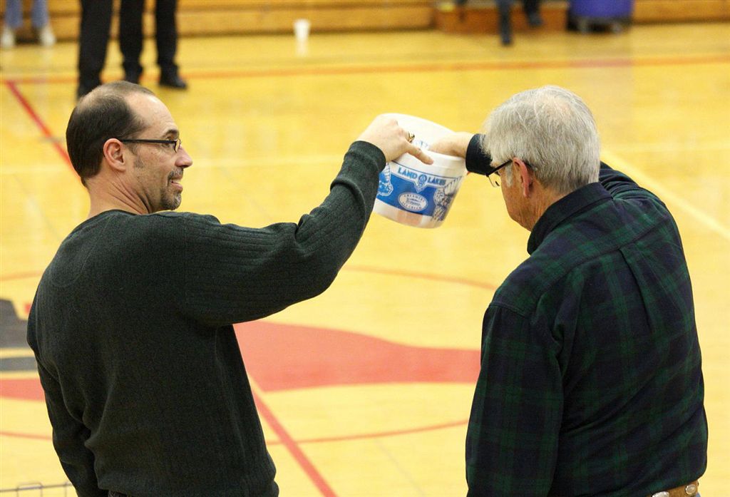 [Wayne Elton. Began his Alexandria career as principal to my senior class. Here he is drawing from a lottery box held by Ted Haar. Probably for some fans to win seats the Hoymster and I should have!]