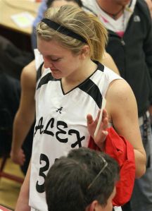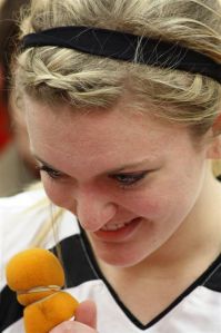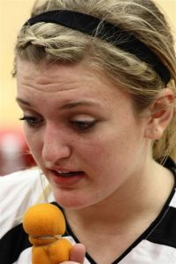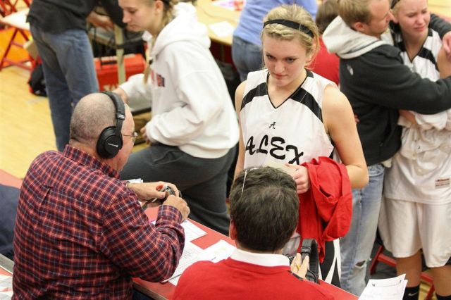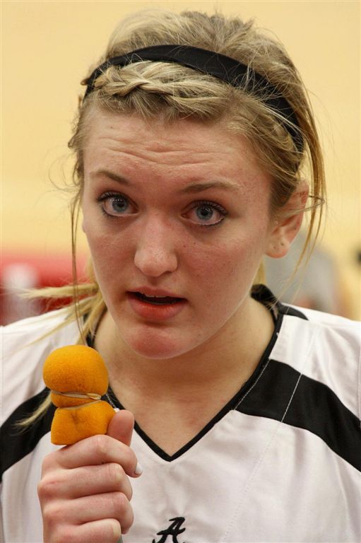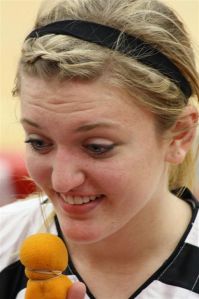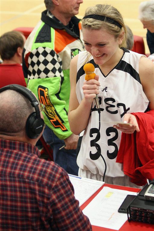 The Willmar game photos are in. Once again, the staff photographer did an excellent job capturing the player of the game interview with KXRA’s Dave Harris and Bob Cunniff. Whitney Gesell (No. 33), 6’1” junior forward, was selected for her 8 points and rebounding off the bench. Whitney is a very valuable asset because she supplies the size and athleticism to spell Sam or Alli, who as the last line of defense can encounter foul difficulties.