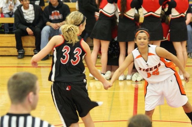 [Lauren (above) and Whitney meet and greet the Tigers to JHS.]