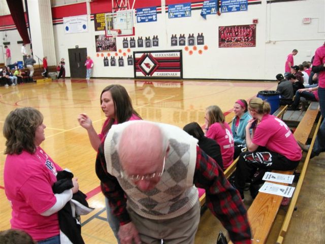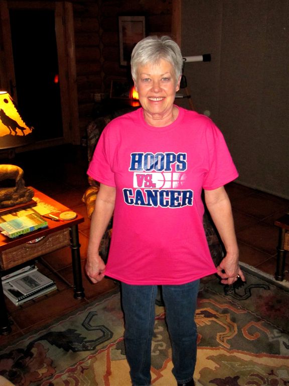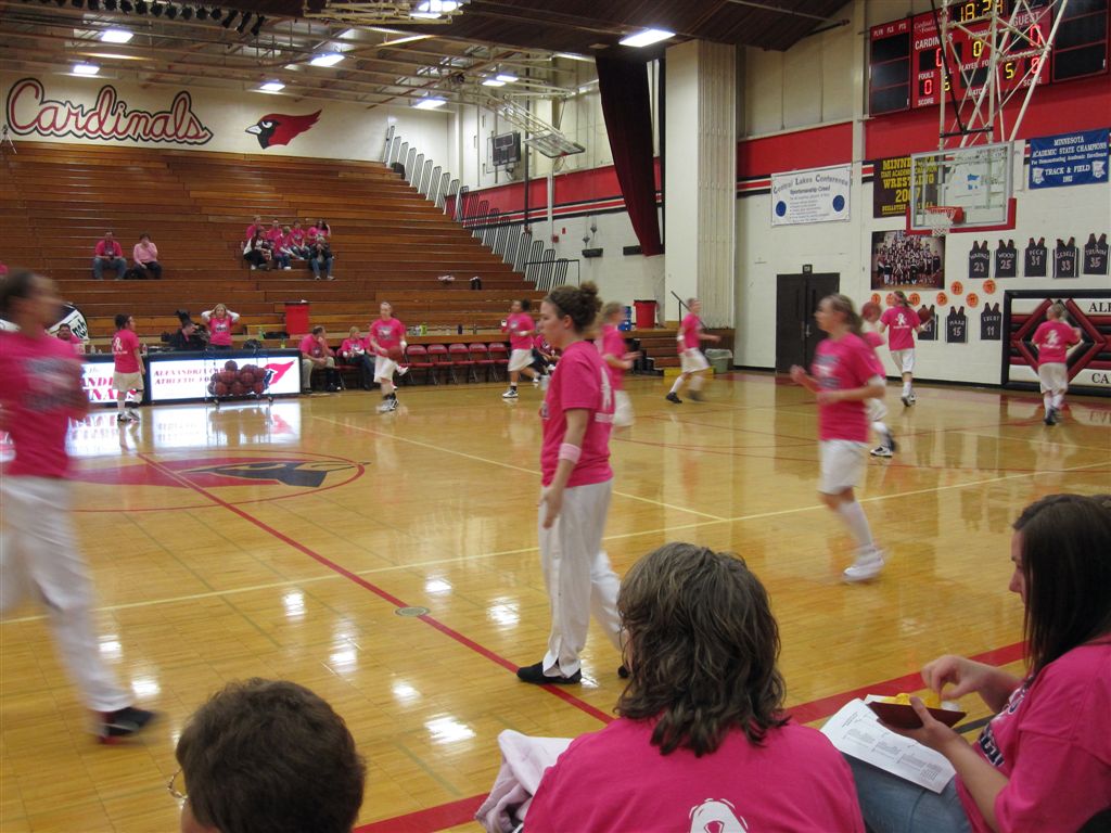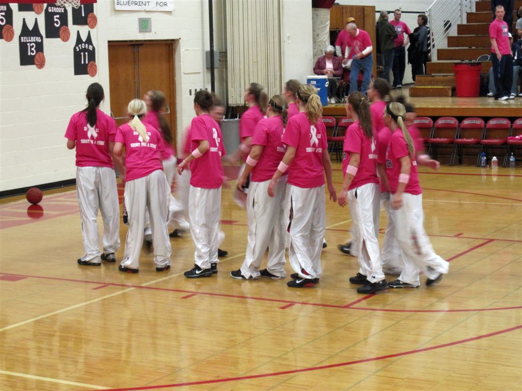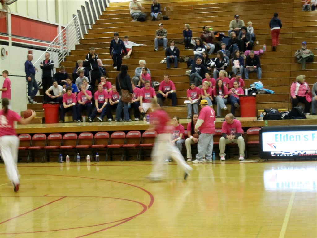 Next, we had to repair back to the house so the supervisor could determine appropriate attire for a basketball game followed immediately by a hockey game. This almost requires professional assistance. The girls’ basketball team was hosting Bemidji on “Hoops vs. Cancer” night. We found Val Trumm on the concourse, obtained our pre-ordered shirts, and entered the gym to find the Pink Shirts displayed throughout the crowd and on both teams. I videoed the warm-ups and the game’s beginning – as you can see at the opening tip, Bemidji featured a sophomore center who was listed as 6’2” though she seemed considerably bigger than that in relation to Sam: