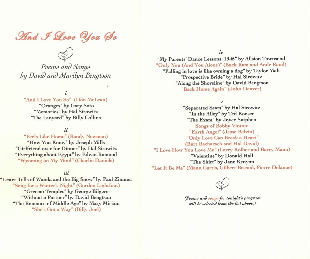 Last night the supervisor and I celebrated our 10th wedding anniversary! Yes, on Valentine’s Day – so I wouldn’t forget the date (though to this day, I can never remember whether it’s the 12th or the 14th?). Over the last several years, this celebration has either taken place at SAWA – or at a girls’ hockey tournament game. Last night – SAWA (the hockey tournament game is tonight). Surrounded by dozens of our closest friends, we enjoyed a four-course meal from Chef Matthew – and poetry and song from Dave and Marilyn Bengston, who for the 3rd year in a row came all the way from Long Prairie to provide the entertainment. Yes, we enjoyed it all.