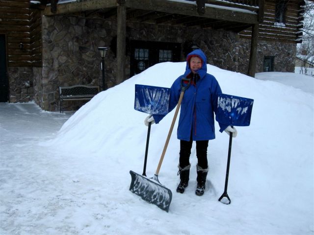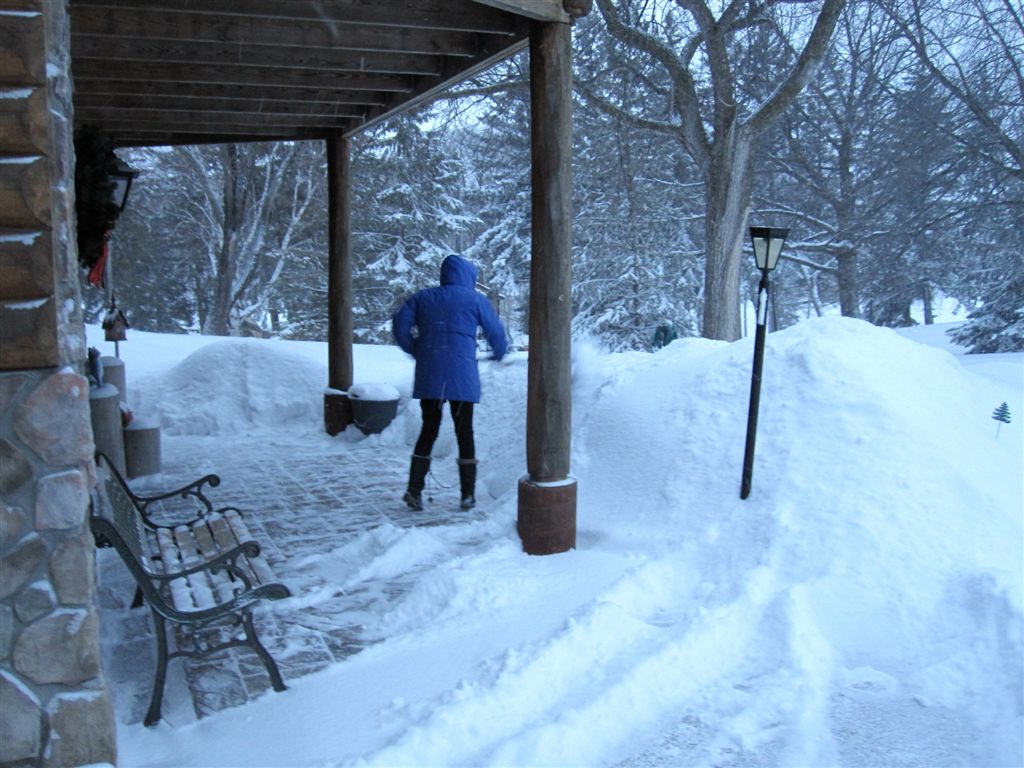 The 243rd blizzard of the season arrived late to Vacationland USA. No snow all day yesterday (though it had been predicted) – but the wind did HOWL. Some time after dark, we peaked out a shroud encrusted window and noticed the little white darlings were beginning to fall from the sky. By this morning, it appeared the predicted 8” had fully arrived. It’s garbage day – we had to figure a way to get the stuff to the end of the driveway by 7:30, the usual pick up time. We waited for daylight so we could see what we were up against. TV was highlighting the nearly 20” of snow smothering the Twin Cities’ western suburbs. Our slab was bare on the north side, but had about a two-foot drift covering the rest of it.