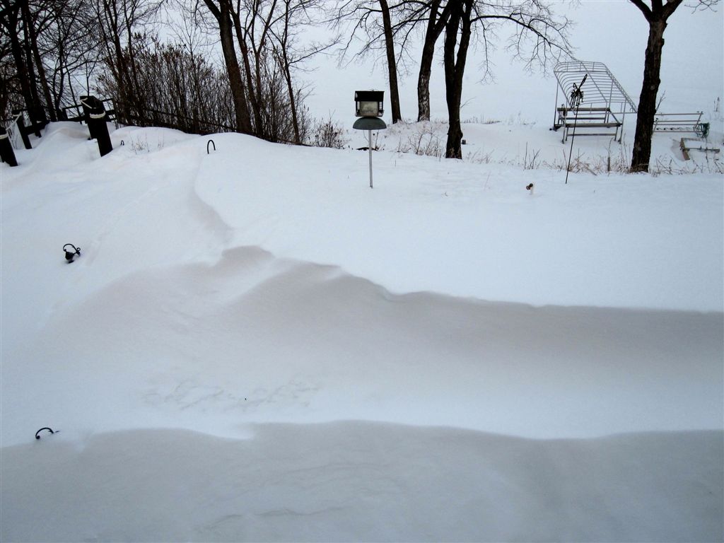 The current event is over. The road side deck had at least a foot of snow on it when I went out to shovel it at 5:00. On the lakeside, wind and snow created some interesting drifts – kind of like living next to the ocean: