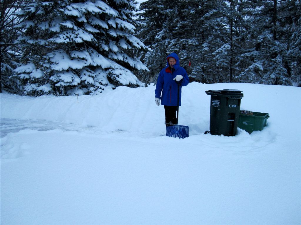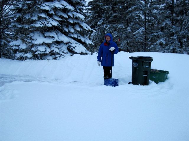 The supervisor and I grabbed our three shovels (we specialize, depending on conditions) and plowed our way out the front door. Once the porch was clear, the supervisor headed down the driveway, shoveling a shovel-wide path. Now we could tell that the driveway had a uniform snow depth of 8-10″ for its entire length. She got about ¾ of a way down when she decided she would take a shoveling break to haul the garbage down. She made it. When we got to the road, no sign of any tire tracks, so no newspaper. Just as well, the deliverer would have got stuck. The snow plow had not been through yet, and the road was covered by a foot of undulating snow.