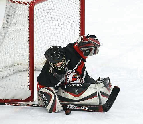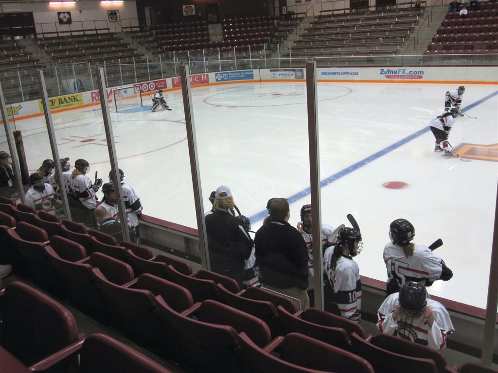 Highlight of the game (and I apologize for not mentioning it to her dad at the basketball game last night): I noted in the first game report that Claire was really sick and wasn’t sure if she could play. Before the Red Wing game, the team was sitting together in the stands – except for Claire, who was lying down and feeling really crumby (“really crumby” in medical parlance means “I wish I was home in bed.”). We don’t call her the world’s toughest 80-pounder for nothing. She played the whole game again – and in the 3rd period, with Red Wing on a power play, Claire controlled the puck with great stick handling for what seemed like a full minute with the entire Red Wing team chasing her around. It was an unbelievable display. Next year, we’ll have her little sister Becca play that role.