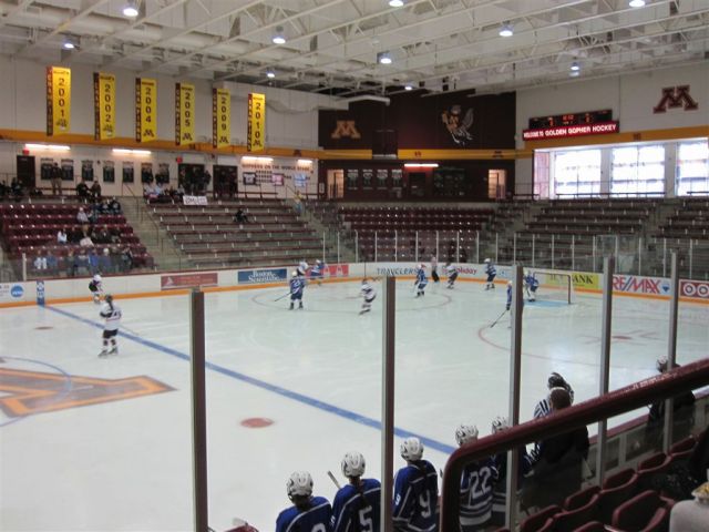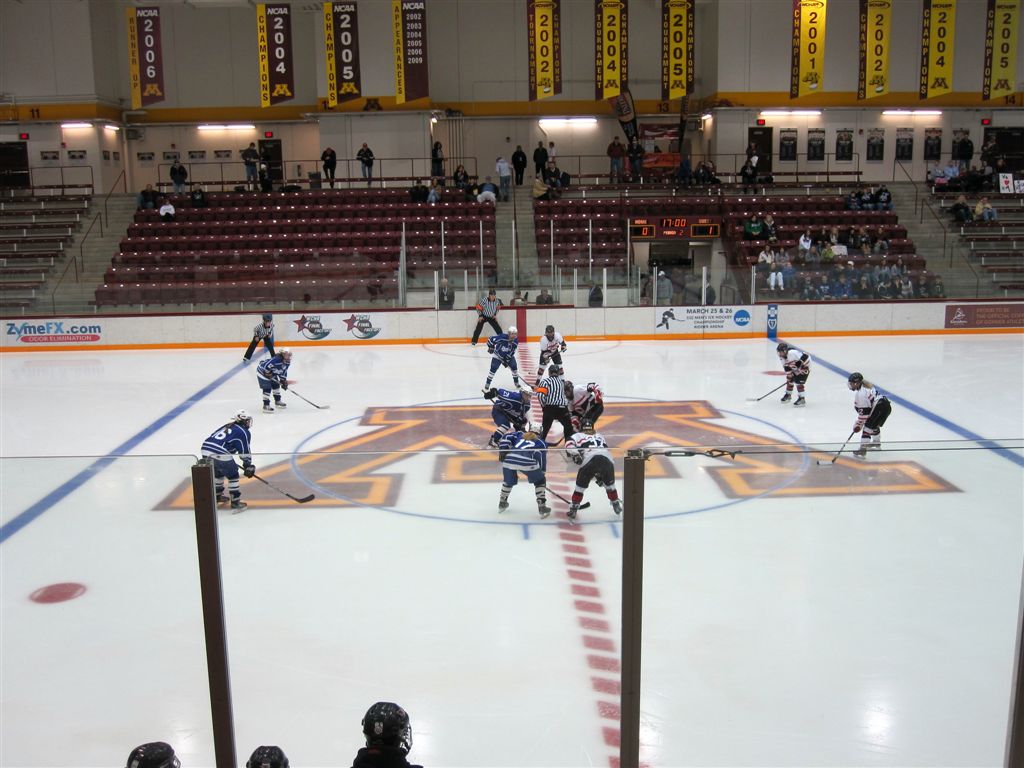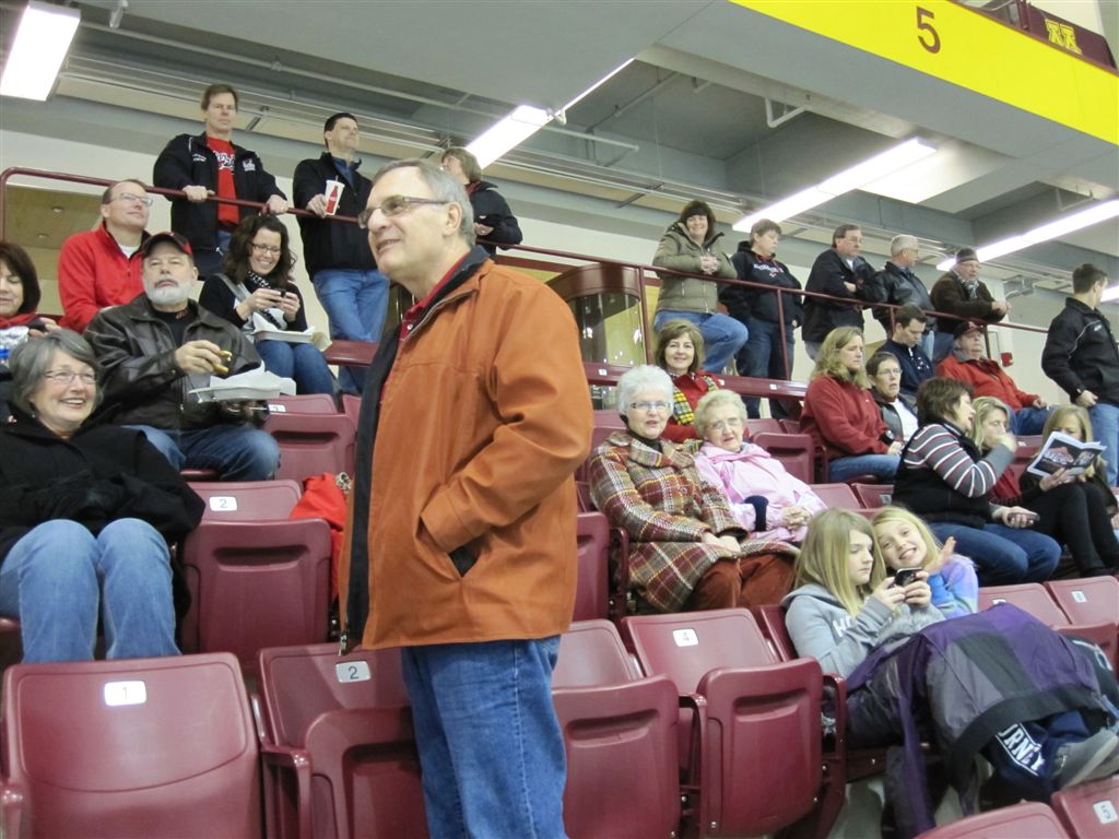 In the morning, we headed down to the “U” where the Cards were playing Red Wing, a first night loser to Eveleth-Gilbert, 5-2. Robo stayed to scout the game and reported that while Red Wing was young and not very deep, they had some excellent players. He said they lost to Eveleth’s superior depth in the 3rd period, but it was a tie game until then. Through two periods, the Cards and Wingers seemed evenly matched. But the Cards had regressed to their late season propensity of giving up soft goals and were behind 3-0 going into the 3rd period. It didn’t help that in the totally unbiased opinion of Card fans, we weren’t getting a fair shake from the officials. At one time, we thought the Cards had scored as the goal light came on. Then, after a meeting of the minds, the refs decided that not only had the Cards not scored, they determined that even though play had stopped when the goal light came on, they moved the face-off outside the zone because a Card had accidentally knocked the goal post off its peg (again, after the goal light!). Around that same time, there were a couple of bad penalty calls – and some that weren’t called that should have been. In exasperation, Coach Mitch Loch used his one and only timeout then – more of a cooling off for him and the team, because he never addressed the team during the timeout. It was obvious the only purpose in calling it was to show the officials he wasn’t happy with the play calling.