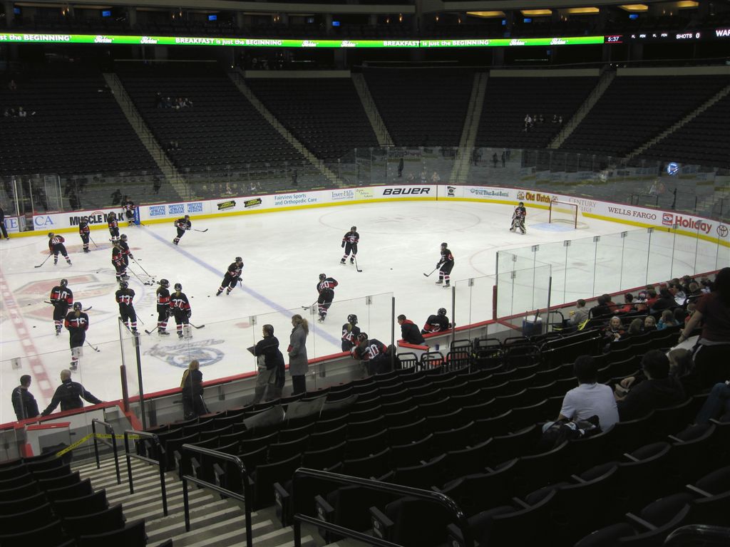 We reached the Xcel Energy Center parking garage in plenty of time for our 3:00 dining appoinment with whomever else was going to show up at Cossetta’s on W. 7th Street, one block from the arena. We browsed the displayed goodies in admiration – pledging to return at the completion of the hockey game to acquire a loaf of peasant bread and some Fontinella cheese, delicacies not always available in our fair city. The Illies, Drown, and Kopischke hockey families – with several offspring in tow – appeared shortly after we arrived. That’s when we got our first piece of bad news. Sara Illies reported that her daughter, Claire, the team’s leading scorer, was really sick and may not play. We were then joined by Alex alums, Greg Johnson, class of ’65 (mine), and Al Grundei, class of ’67, who was also going to the game. We had a nice leisurely lunch of things dazzling to the taste buds (yes, these trips are always about eating), and then departed for the “X.” As we were heading out, we ran into the Herd hockey famly, who had to report their daughter, Shanee’, was not feeling too good either. Things were looking bleaker.