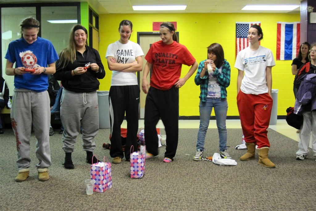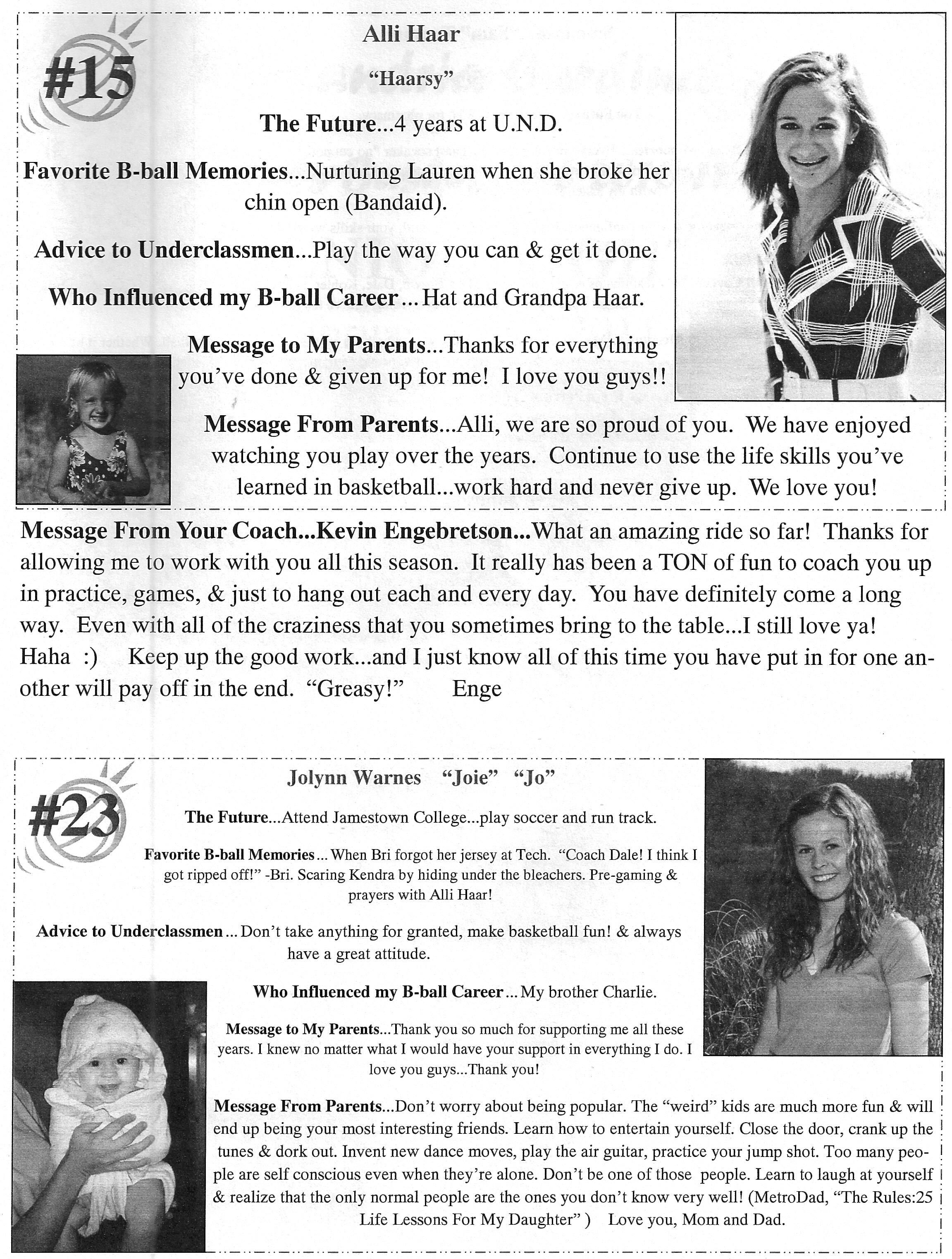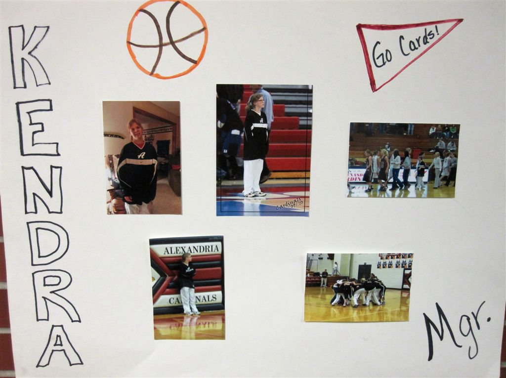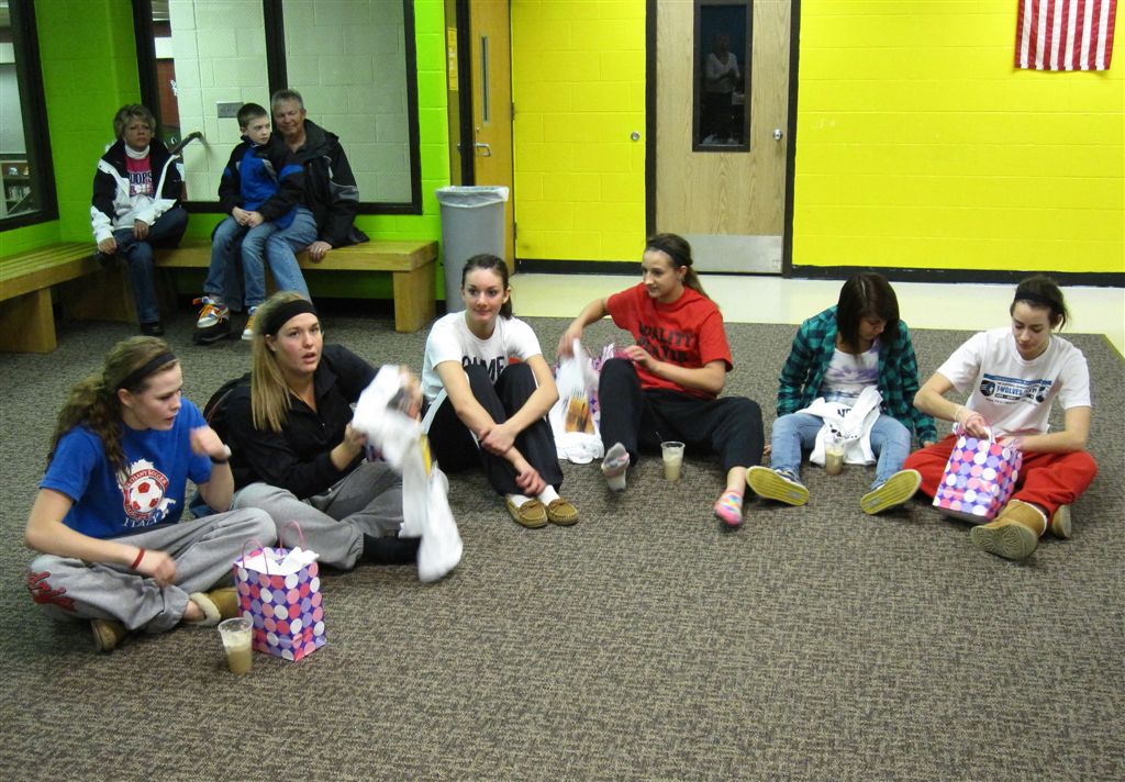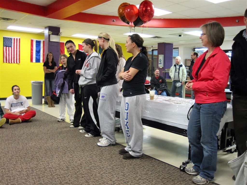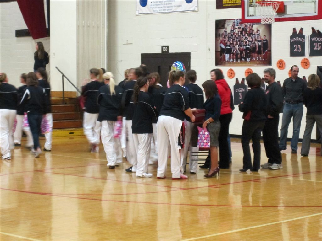 Big crowd last night – we sat with the McCoys and the Rileys. There was no room in our row when new Super Fan Al Grundei, fresh off his state hockey tournament appearance, arrived. We hope he was able to sit with Super Fans Hoymes and Halvorsons. After the game, we all were invited for root beer floats and cookies with the team. We were joined there by basketball Super Fans Marlene Lorsung and Vivian Mattson. The coaches toasted the players; the players toasted each other: