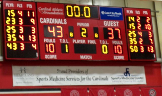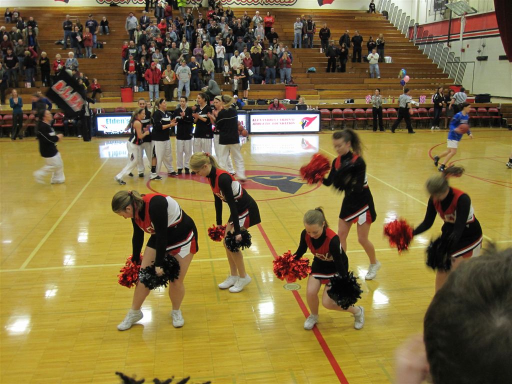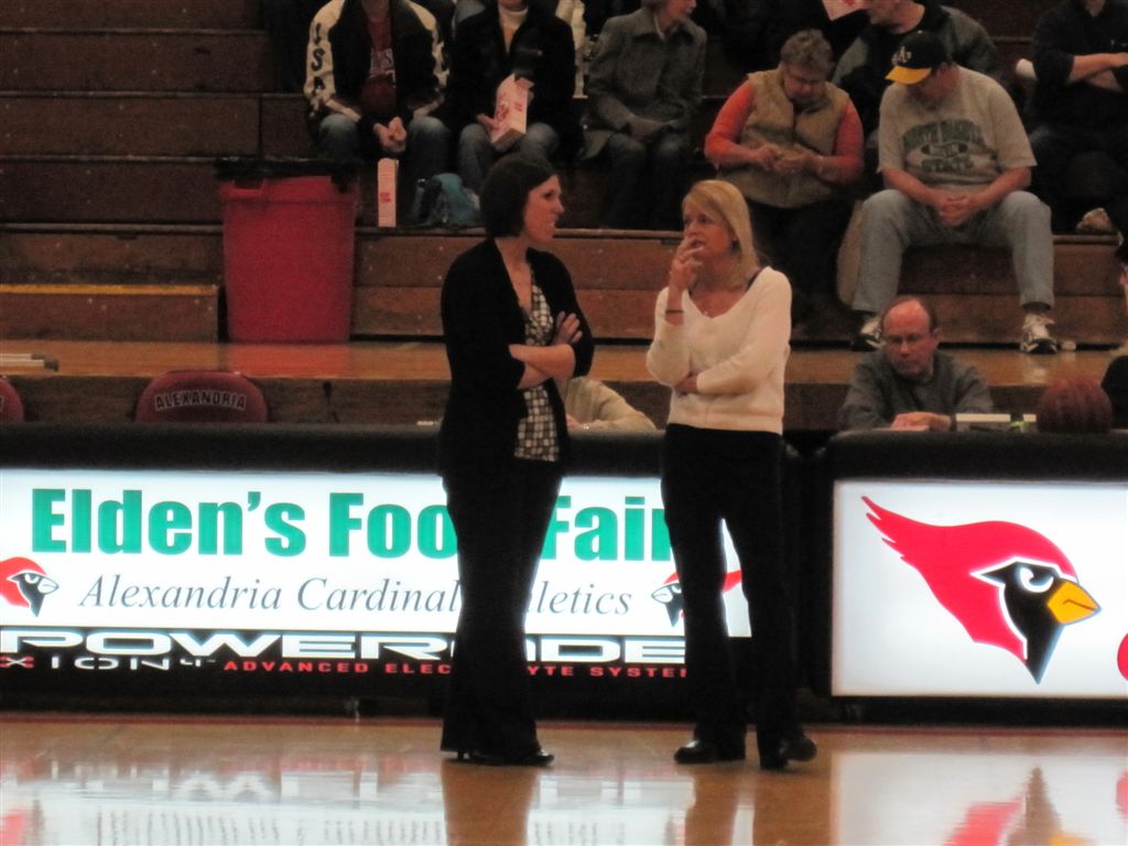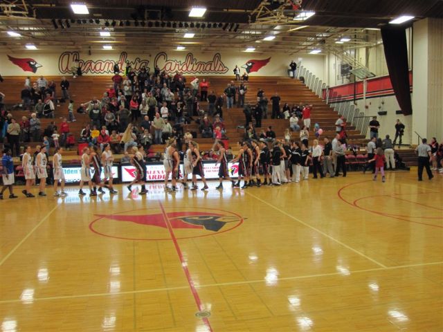 Column III, or physical dominance by the Cardinal girl basketballers. After the deer photos, it was off to the JHS gymnasium. It was senior night, the last game of the regular season, a game between two teams with 20-3 records – the Cards v. the Sartell Sabres. [Aside: The Cards apparently took a lot of Fergus in their previous game – the Otters subsequently lost to Hawley and last night beat St. Cloud Tech by one point on a shot at the last second.] Sartell won the first game – at their place, in OT, when again the Cards were plagued by foul trouble and Lauren Trumm fouled out in the 2nd half. This time the Cards came out with a vengeance.