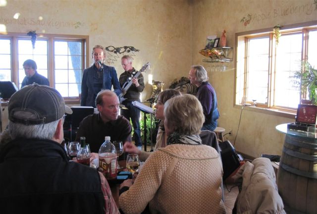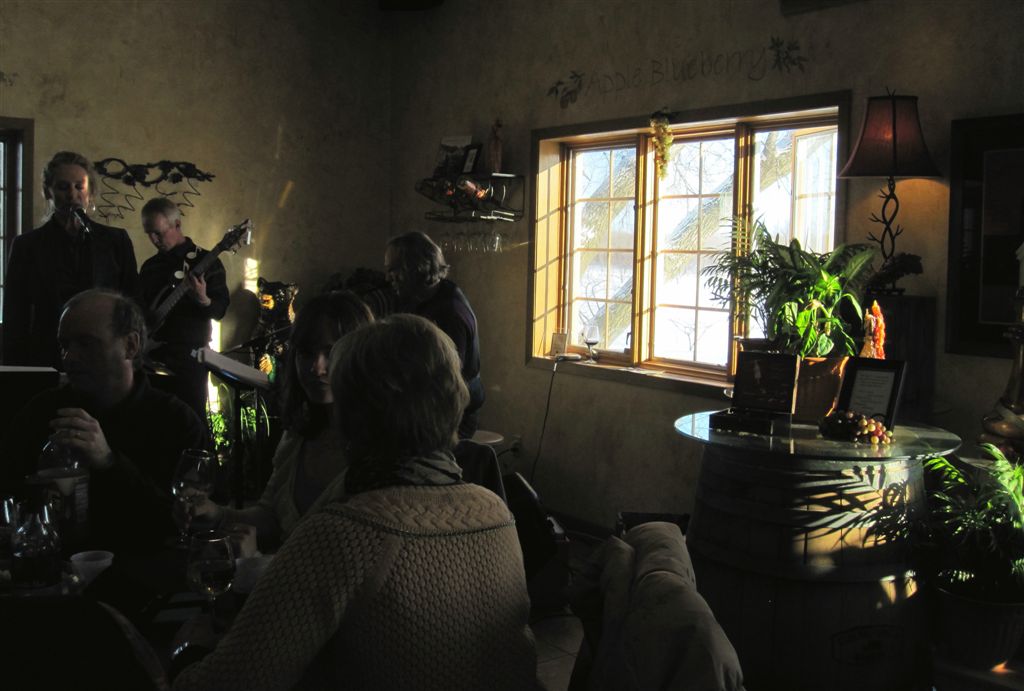 Yesterday we ventured to the winery expecting to see Matt Veline as the musical performer. Instead, we found Finestra w/ Karen Page. We like them too – apparently they had to flip-flop weekends with Veline. The place was crowded, the fireplace was going, and sunlight was streaming through the windows – it got hot in there. A Minnesota solution was to crank the windows wide open (see, in the photo?) though it was below zero outside – seemed to work.