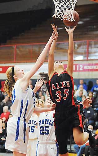 [From the Echo: Sam scoring over Sartell’s 6’5″ center. We have reason to believe that the person in her Cardinal red, on the far left side of the photo, is Ruthie!]