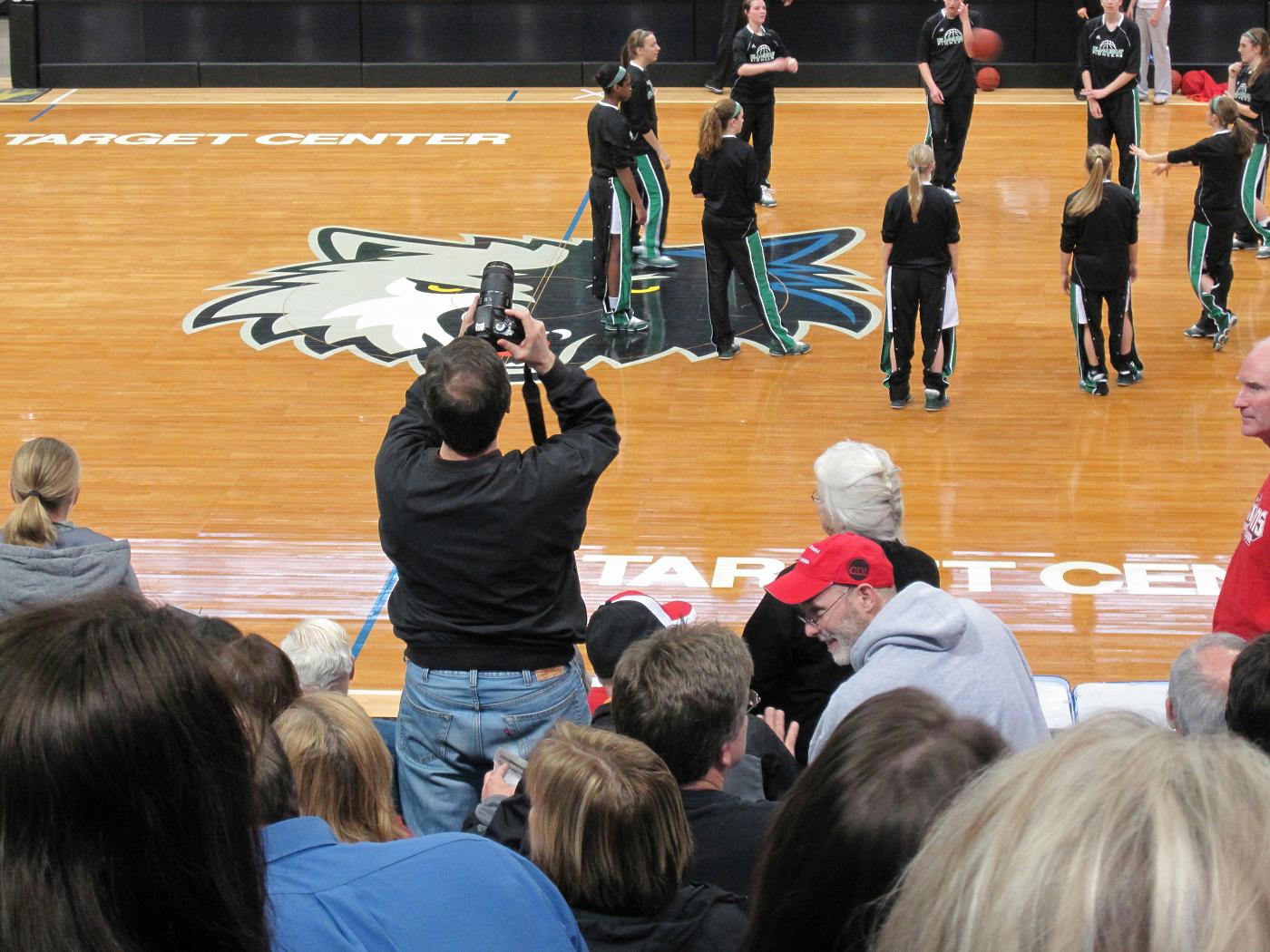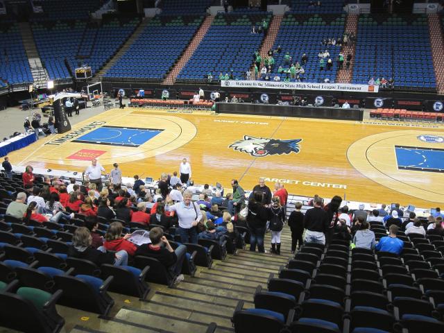 The 2011 Minnesota girls state basketball semi-finals – our Cards v. the No. 1-ranked and undefeated Hill-Murray Pioneers. We found it telling that of the four teams in the “final four” in Class AAA, our Cards were the only team that wasn’t a metro-area private school (the other two teams were De La Salle and Benilde-St. Margaret). So, we are the state public schools champions! We also found it telling that Irondale Cam, the “Troglodyte” who doesn’t much care for girls’ sports (despite having a gymnast daughter), deigned to make an appearance at Target Center with us. Will wonders never cease?