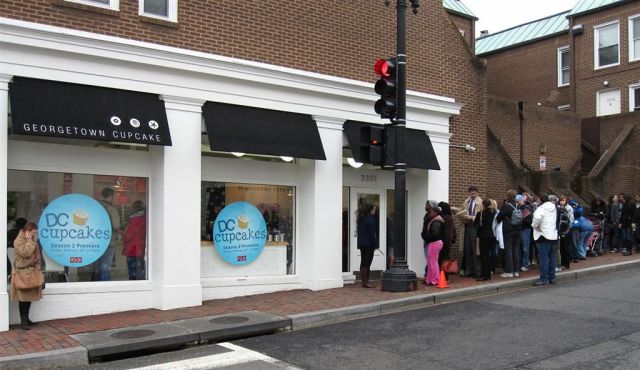 [From lunch, we walked several blocks to the hottest place in town – DC Cupcakes. Gretch said she had never been able to get in because of the lines. It was mid-afternoon on a weekday. The line stretched up the block, manned by power brokers in Armani suits and camel hair coats. We decided not to wait.]