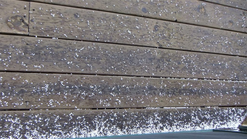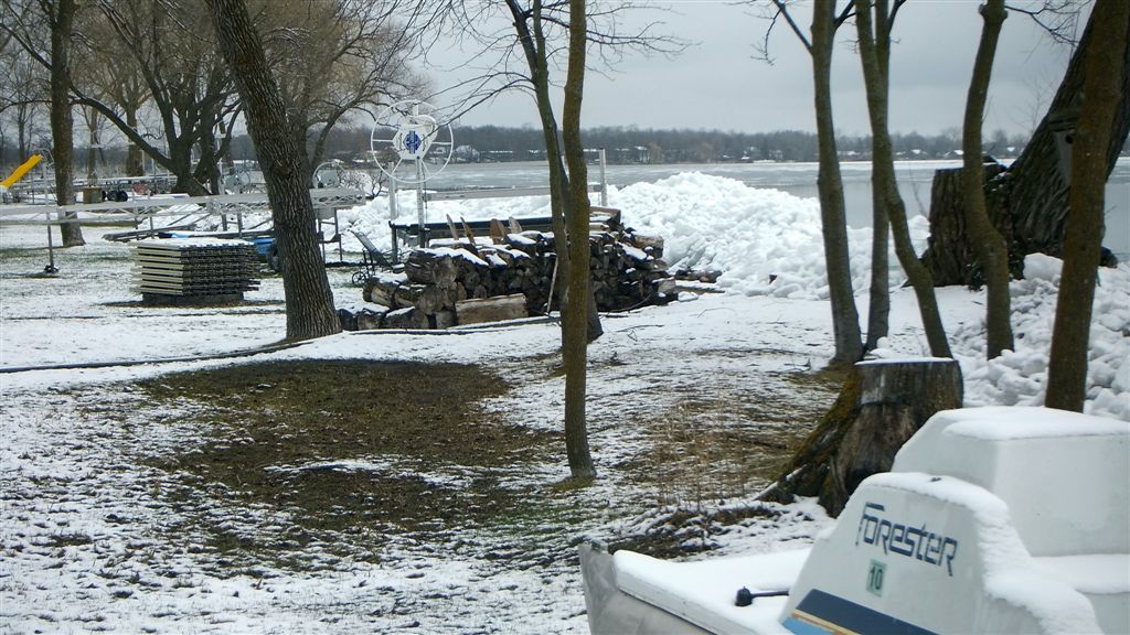 April 20. A month into allegedly spring. We had our second snow in a week this morning; this afternoon we had two episodes of sleet. The supervisor and I slogged our way to the end of Darling Heights Place this morning to check on reports we’d heard about ice dams. [Oh, and to say “hi” to neighbors Tina and Noel Thompson, here checking on their Lake Darling property – hard to believe they have been gone (now living in Steamboat Springs) for eight years now!] The reports were confirmed – these photos were taken about two blocks from our house. Ice dams, blown by strong winds over the last week, have climbed onto shore in spots and have damaged boat lifts and docks; and have taken out bird houses, wood duck houses, and anything else in the way: