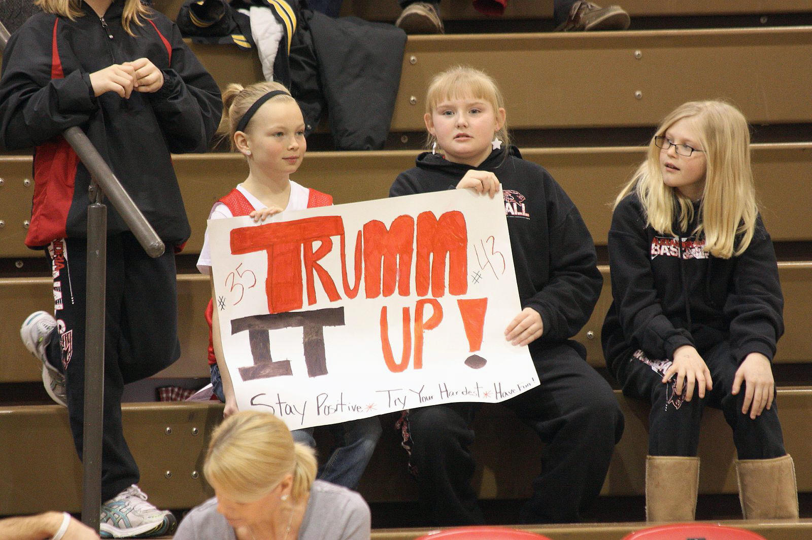 [Editor’s note: To the young ladies holding the sign above – not to worry, I recently went to Cowing-Robards and ordered more Trumms. Yesterday morning at the “Y” I rifled in 31 consecutive free throws. That is the 2nd time I have cracked the 30 barrier as an officially designated old person. And it reminded me I have a lot of catching up to do to wrap up the basketball season.]