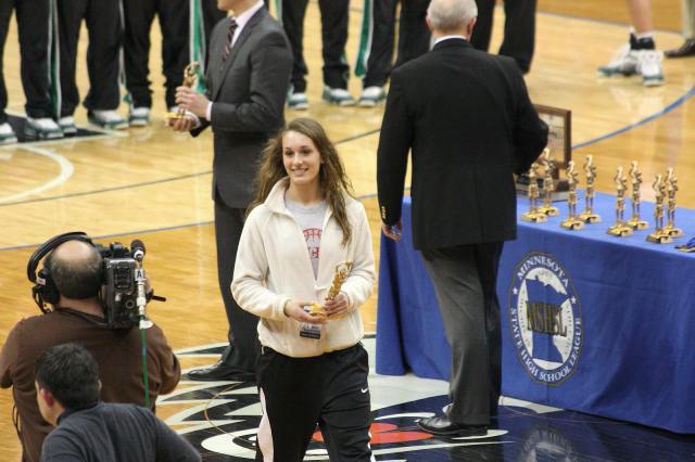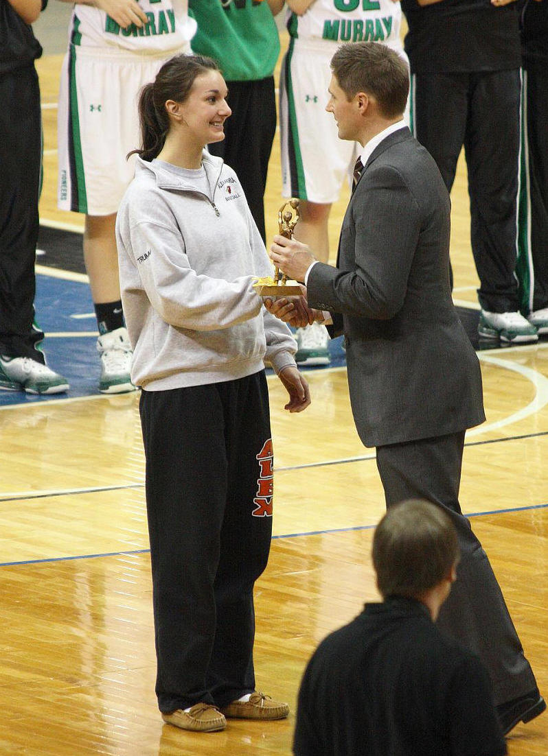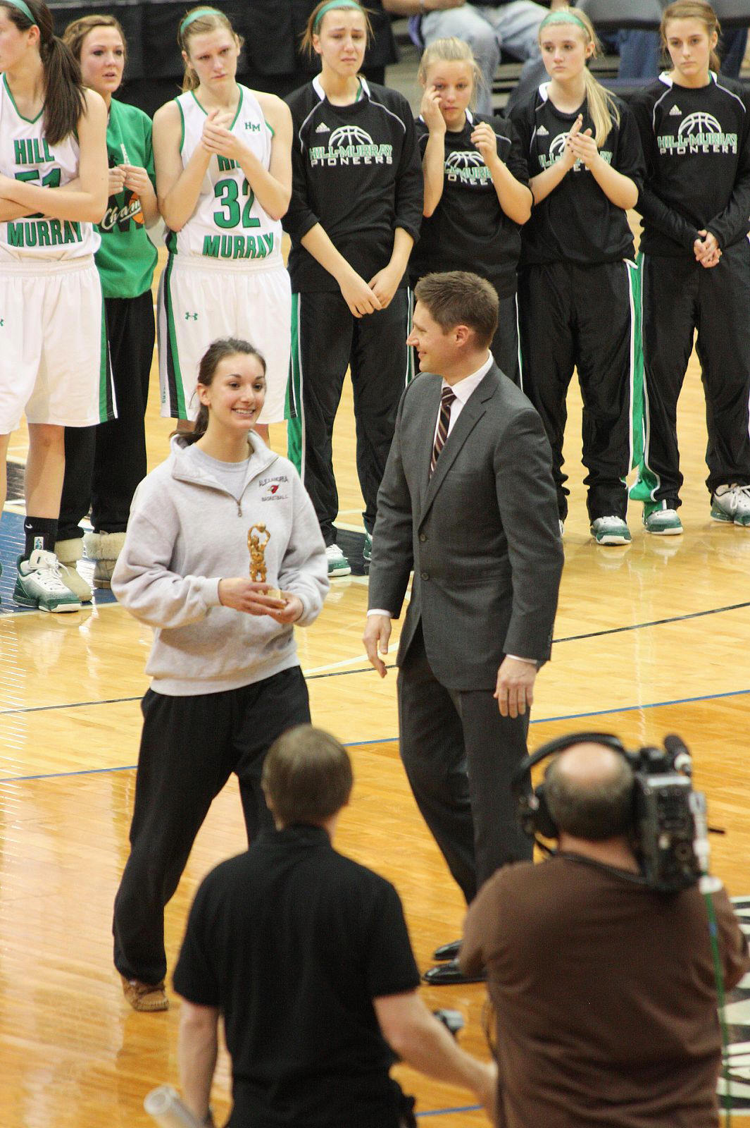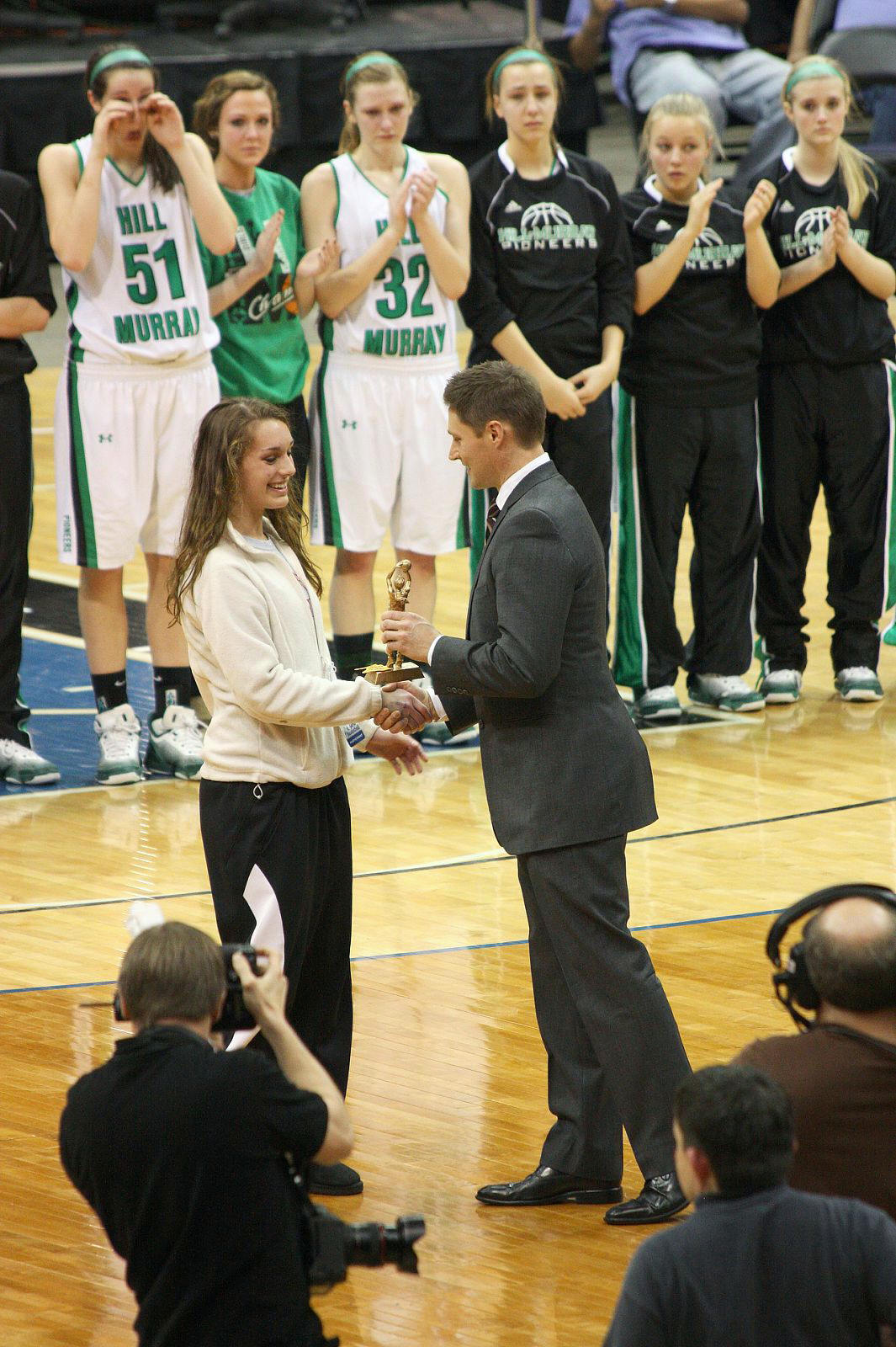 You may recall, though it seems so long ago now, that Sam and Lauren Trumm were named to the all-tournament team at the girls’ state basketball tournament. The staff photographer, their proud father, captured the ceremony. As members of my favorite team, Sam and Lauren earned their honors in a manner they had all season – as part of the team, where every player’s role was to play defense like crazy and to share the ball. Lauren is the upfront catalyst who could often score points in bunches when the team’s defensive pressure caused turnovers. She is a great finisher. Sam is the under-sized (at 6’1”) center who throughout the tournament was facing opponents taller than her – often by several inches. But at no time during the season did she face anyone who was quicker, faster, or a better leaper than she is – and it was great fun to watch her use those abilities.