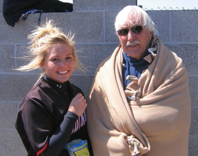 [May 3, 2008] After following Brittney, the oldest Bruzek daughter, through her career as a Cardinal sports star in hockey and softball; Gracie is the next in line. She is the point guard for the basketball team and the shortstop for the softball team. The photo was taken today behind the dugout- the Cards were hosting a four team tournament (results by separate e-mail) on a bright sunny day, but with wind chills probably in the 20’s. Nice serape, Bud!