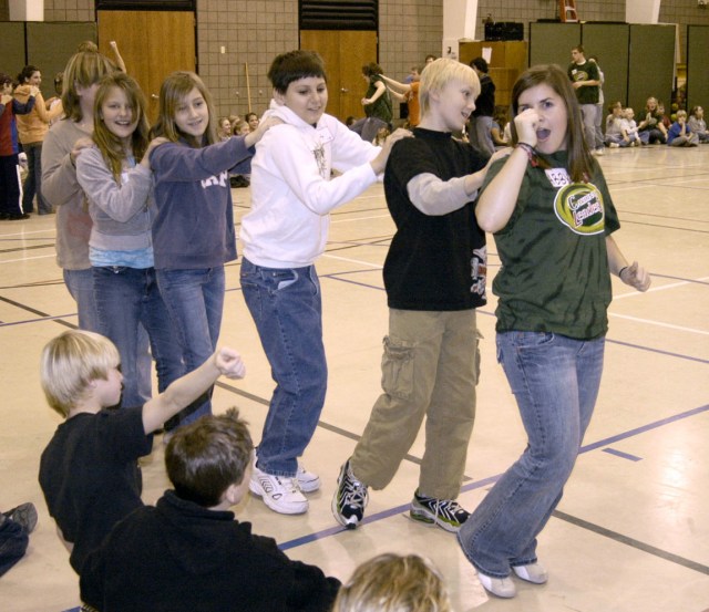 [March 20, 2008] A little photo (from the Echo” about why everybody loves Abby Williams. Here she is – all-state hockey player, over 300 points in her career – a senior leading a bunch of 5th-graders in her role on the Cardinal Leadership Team. You can see why all the little girls look to her as a hockey mentor and want to play the sport – they’re all already as big as she is!