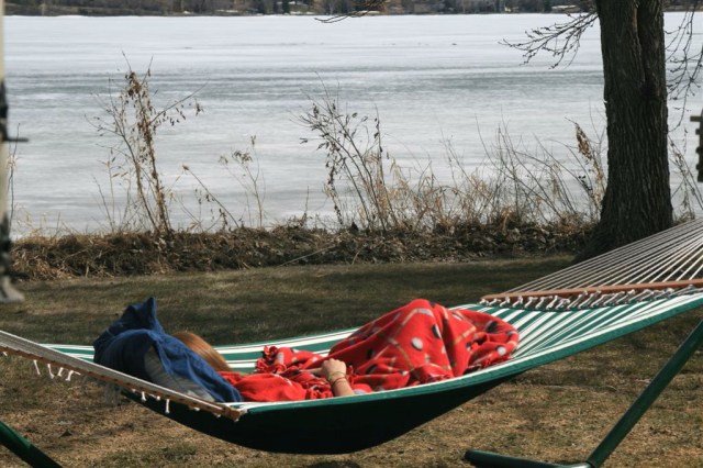 [Sue Justice writing about her hammock-habitating daughter Danielle on April 17, 2008.] I think she wants MY job! Or is she dreaming of the perfect job….? This was taken today around 3:30 pm. It’s 56 degrees outside. Notice the completely frozen lake in the background.