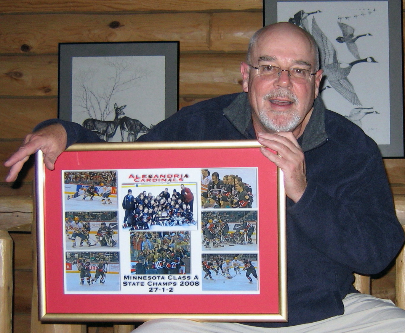 [November 19, 2008] While Ruthie was spending the day trying to determine who would be the next U.S. senator from the state of Minnesota (and looking “sophisticated, intelligent, sexy, and sharp” doing so, according to a fan, who may also double as her agent), the cub reporter spent his day trying to overcome his recently diagnosed lower-back arthritis by going to his chiropractor (who informed him he also has an arthritic neck and shoulders [we’re beginning to think major hallucinogenic drugs here]) and then on to the “man’s mall” to get a Stability Ball (appropriate tool for someone who is generally unstable, as witnessed by the ever growing length of this sentence) for therapeutic purposes. Here he performs his magic on said ball, which he was required to inflate with a little plastic thingee that came in the box. Said inflation took several hours, with multiple stops to pop nitroglycerin pills to ward off the frequent angina attacks that occurred as a result of the inflationary efforts. The day was saved by the arrival of our framed poster of our girls state hockey championship. I hope you noticed that at no time during this mental rambling was Sarah Palin ever mentioned. Thank you . . . and goodnight.