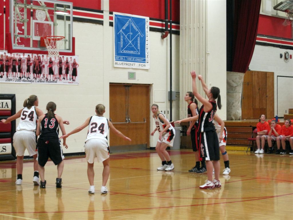 Anyway, the Cards lost to the Spuds about two weeks ago in a game where they let the Spuds dictate the pace of play. Moorhead in a half court game was not what the Cards wanted to play – the Spuds are bigger and better shooters. Last night the Cards played a ¾- court trapping zone press all game – and it was a thing of beauty. With Kate “The Whippet” Gearman at the point, I can’t imagine how a team could have played a better game defensively. Moorhead shot great – I bet over 50% for the game – but for the most part the Cards drove them to distraction. With the long and leans (6-footers Angela Christianson, Sam Trumm, and Alli Haar) on the wings with the quickness to step in the passing lanes, and Gracie Bruzek playing free safety in the back, the Cards were often heading full tilt in the other direction with Kate, Angela, or Sam finishing a fast break. The girls have amazing stamina – it’s nonstop running all game. The following video will give you an idea. (The stills include Angela and Sam (No. 35) shooting free throws – as a team, though, they must have missed 15. That could be a problem when tourney time rolls around.)