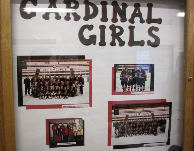 The Alexandria girls’ hockey team celebrated Martin Luther King, Jr. day by beating the Otters last night. This was a game between the pre-season conference title favorites – until St. Cloud combined into one team, that is – but the first period was played as if both teams had the holiday blahs. There were only 5 shots on goal total for the period, and I don’t think the Cards registered their first until way late in the period. Although the quality of play stayed pretty ragged for the entire game, the intensity really picked up making for an exciting game. Michelle Anez scored first for the Cards but Otters tied it up by the end of the 2nd period. The Otters scored early in the 3rd period to take a 2 – 1 lead. Then, after what we believe was a delay-of-game call, Shelby Iverson of the Cards was awarded a penalty shot. Shelby is a big part of what we call “the future” – a freshman center who is already a fan favorite because her naturally curly hair makes her requisite ponytail a tad askew. Well, she made a beautiful move and scored, lost her edge and crashed into the boards, but laid on the ice pumping her fist. Then I thought, what a putz! I’m allegedly the cub reporter, and I sat there the whole time with my video camera in my pocket during this rare hockey event (only recall one other penalty shot – Abby Williams scored on one several years ago – forgot to “shoot” that one too!). [But then I also hadn’t noticed until last night that the Super Fans are pictured in the team display case (lower left) at the arena.] Shortly thereafter, Michelle got her second goal – the game winner. The Cards held on as the Otters pulled their goalie late in the game.