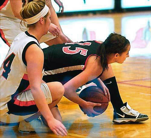 The photos show Bud Bruzek, dad of point guard Gracie, sitting on the far side of the gym, upper left; and the opening jump ball with Angela Christianson (21), jumping center, and Kate Gearman (5) and Gracie Bruzek (23):