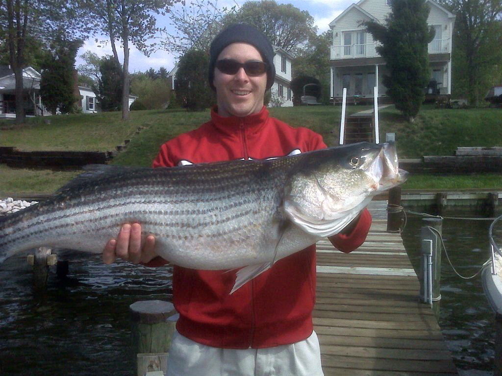 [These photos have absolutely nothing to do with the subject matter. I just decided to throw them in as a little change of pace from Super Fan photos (I heard that!). That’s Todd Jennings, a longtime softball teammate, in the top photo with a couple of nice stripers (a/k/a, rockfish or striped bass); and Chris Sullivan, son of our softball team’s manager, in the bottom photo with a really nice striper. I will assume they were all caught in the Chesapeake Bay. You’re welcome.]