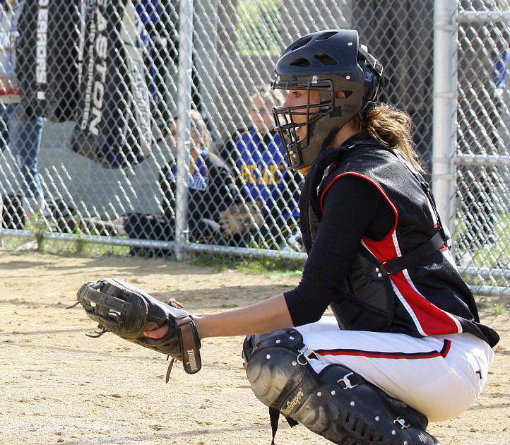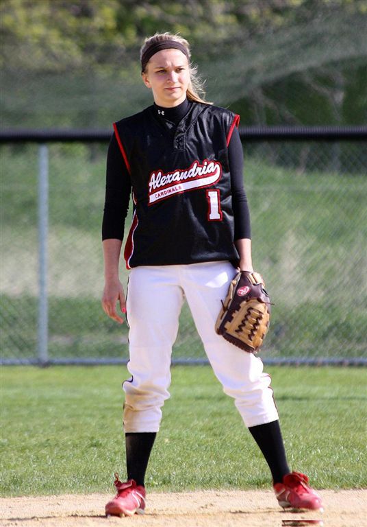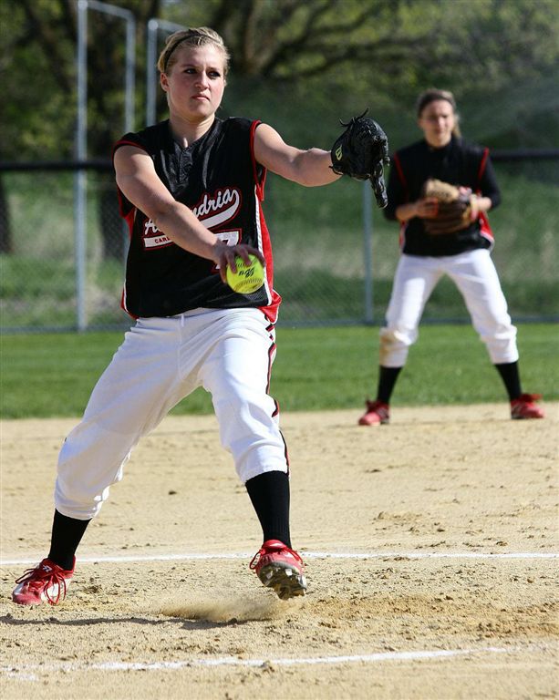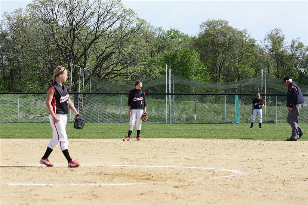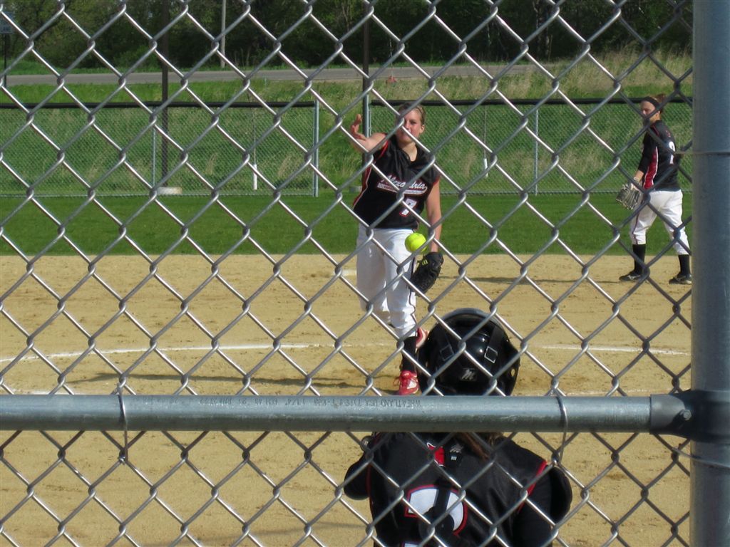 [Taylor Ellingson warming up with LT at bucolic Woodland Elementary field. Also in photos (l-r) are junior leftfielder, Quinn Kragenbring (and hockey player); sophomore shortstop, Danielle Carlson; freshman centerfielder, Amanda Christianson (and basketball player); and sophomore 2nd baseman, Jess Syvrud. A chain-link fence is fan friendly; they are not photo friendly.]