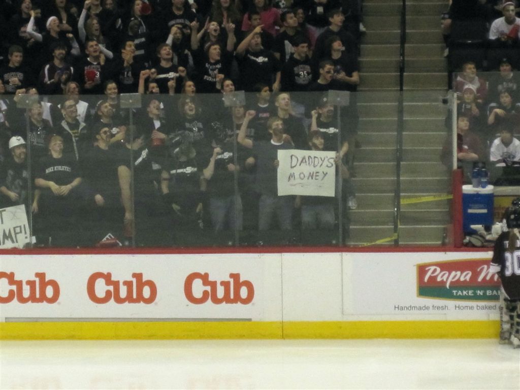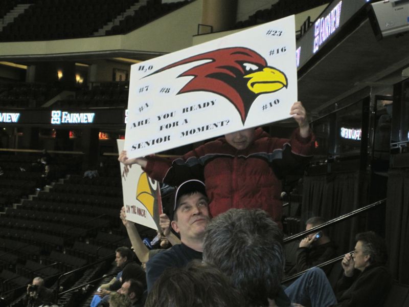 This also gives us the opportunity to pass along our favorite sign from the tourney. From the So. St. Paul student section in their game against Breck – a representation of the public school v. private school (“cashmere sweater, camel hair coat”) animus. Ha!