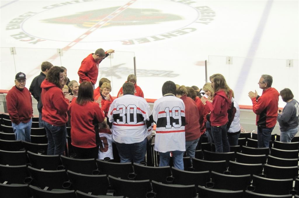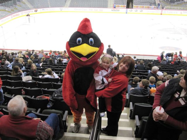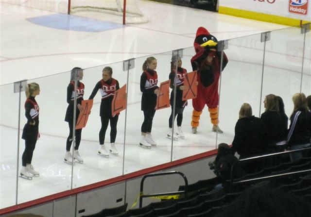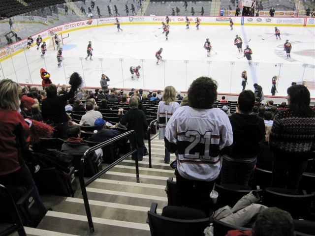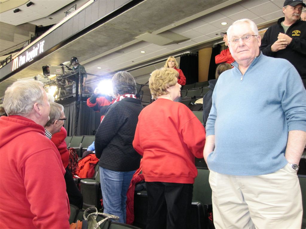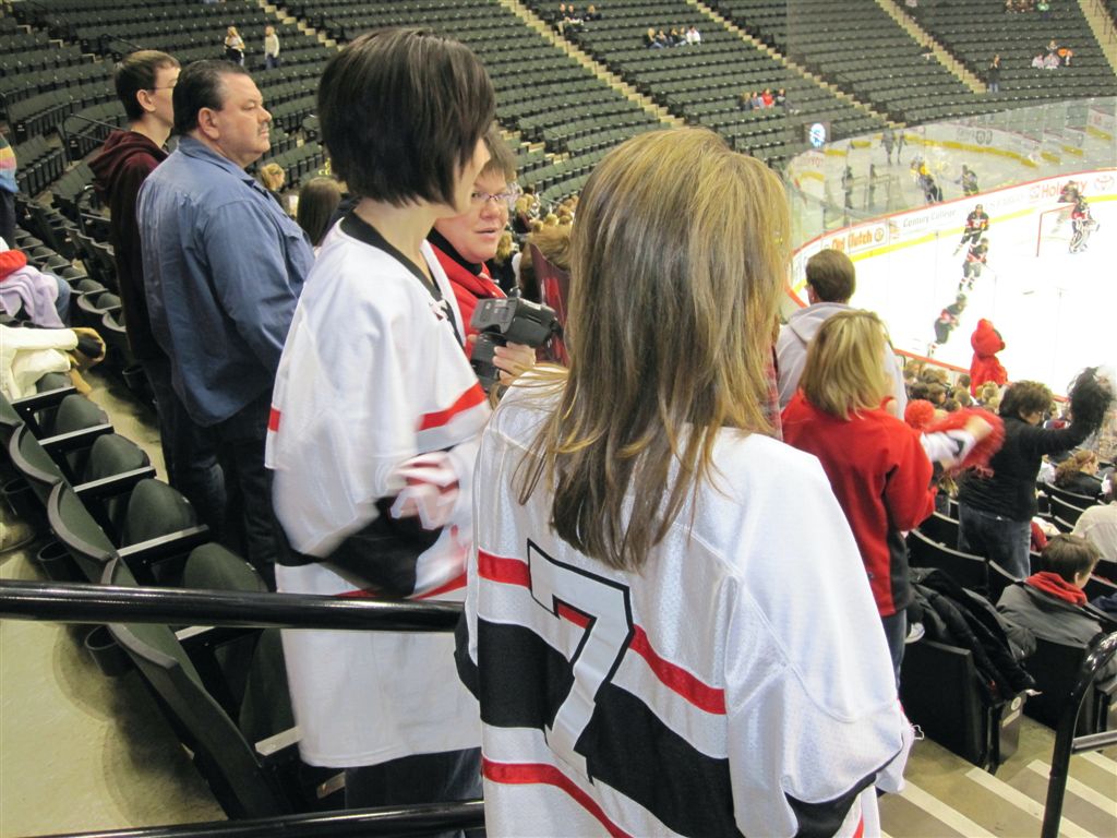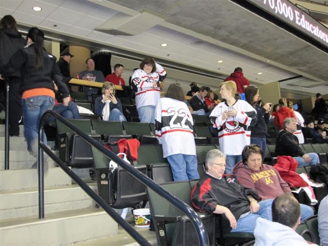 I think we’re down to the photos only part of the program. Here are various fan scenes – from the Super Fans to the hockey moms (who were wearing their daughters home jerseys – there was some debate among the moms as to whether the daughters had washed them first!).