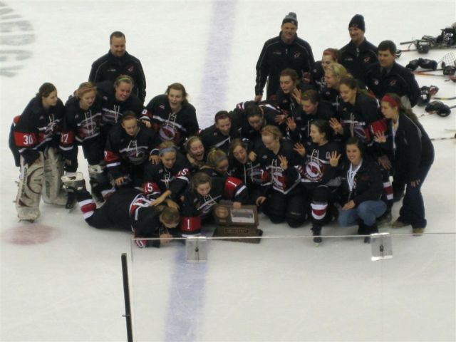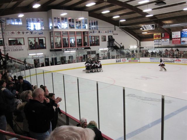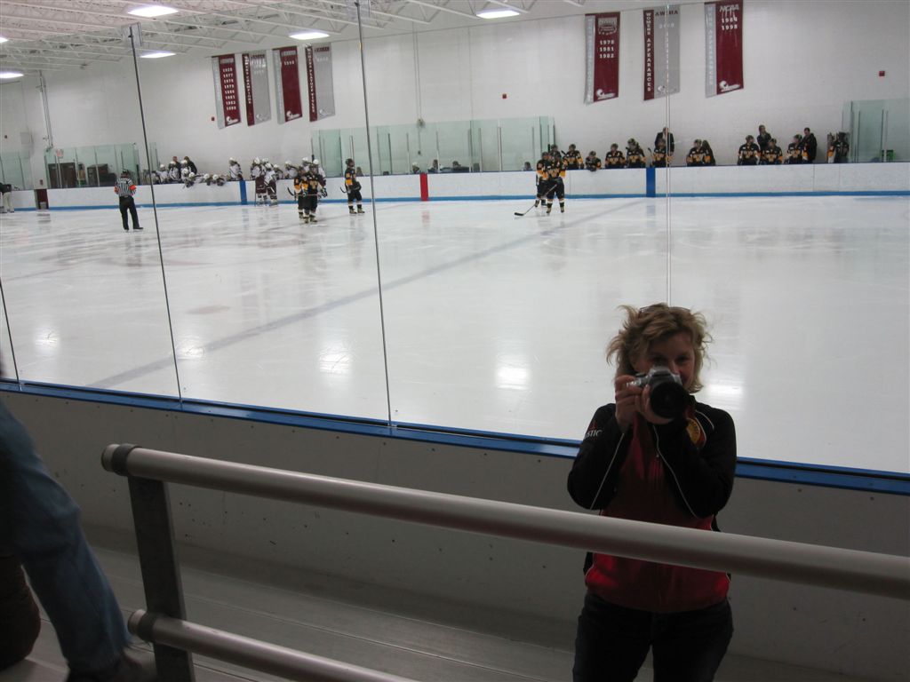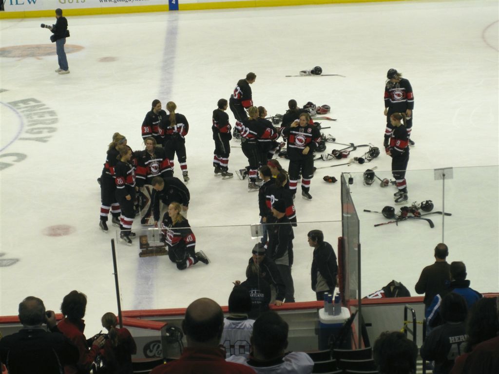 The team was very disappointed at the end. To their credit, when they requested the captains come forward for the 4th place trophy, they all leaped happily into the air and were proud of their achievements. They stayed on the ice in response to the fans for photos – collapsing into giggles as a team – then the seniors went out for more photos. They had a good year. And with 16 sophomores or younger on the team, they should be competitive again next year.