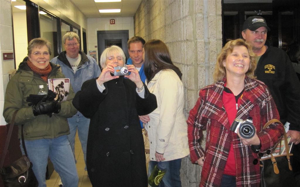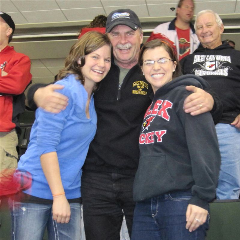 Abby and Nikki (the centers on our state championship team) were at the “X” to watch this year’s team in the state tournament – and to have their pictures taken with Ted Justice, a/k/a Teddy Hockey, the proud father of Danielle, the goalie on that championship team. Then, with the Annens, we went to the Augsburg Ice Arena, to see the Division III game between the Auggies and Gustavus – great hockey to watch, but the Gusties are ranked 8th nationally and won 5 – 0. Danielle plays goalie for the Gusties (standing lonely in goal – waiting for others to send after game photos of her with the group) – and Sara (No. 19) and Andrea (No. 11) were playing their final home game for the Auggies. Photo of them after the game, with father John in background, and older sister Alison (sorry about the cutoff) on the right. We also saw Brittney at the game – I think Viv got photos. And finally, Abby was at the Alex boys home hockey game yesterday, with Paige Scarborough, to see her younger brother Thomas perform.