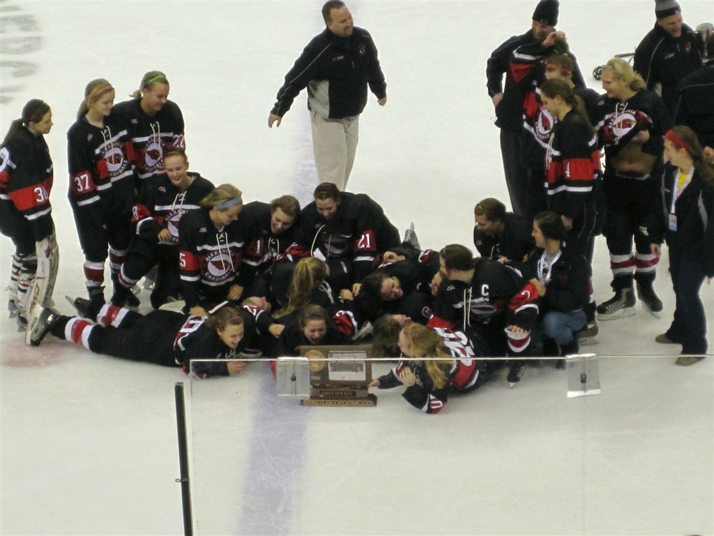 Similarly, this past week brought to mind that an entirely different group has replaced the sports heroes of our youths -the Harmon Killebrews, the Fran Tarkentons, the Bobby Bells, et al -. Our sports heroes now are the likes of Abby Williams; Nikki Ecklund; Danielle Justice; Alison, Andrea, and Sara Toft; and Brittney Bruzek – all Cardinal hockey alums. And this week we got a chance to see them all again, much to our delights!