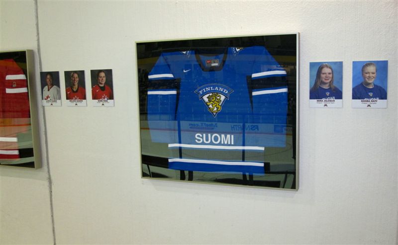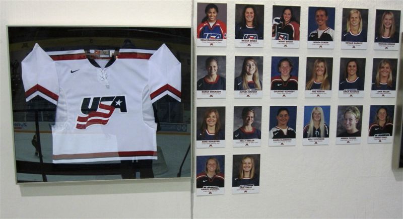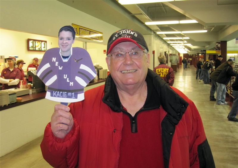 So, till then – more stuff from yesterday and today. We had the “Cardinal” eyeing Robo; and Mark Meuwissen and son Ryan holding a sign for all the seniors, including their daughter/sister, Beth Rindy, No. 16. At Ridder today, Super Fan Bob ran across a New Ulm fan and borrowed the photo of the goalie for this photo – Bob was “educated” at New Ulm Nunnery getting his ears boxed by the sisters. The Ridder wall had photos of Gophers and former Gophers who are Olympians – including Finland’s goalie. We got home just in time to see the Finns beat Sweden in OT for the bronze medal in women’s hockey – the usually stolid Finns had a crazy celebration, it was fun to watch. We laughed when we reviewed the Olympic team jerseys on display – the Canadian and Finland jerseys were “Made in Indonesia,” the USA jersey was “Made in Canada” – go figure!