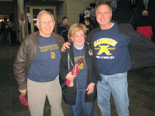 [Erratum: The editor must fess up to never having done a “piece” on the first game of the state tournament – v. Mahtomedi. We lost. They had a superstar defenseman. All I can offer are some pre- and post-game photographic evidence, as follows. 1) The Dittberners meet a family member at the “X” – from Mahtomedi! 2) The Super Fans run into our hero, Abby Williams; 3) Stephanie Sahli, former hockey cheerleader and CEO of the AGC beverage cart was there and was photoed with Robo; 4) On the ice at the “X”; and 5) Post-game nosh at Mort’s where we were met by the HQ: