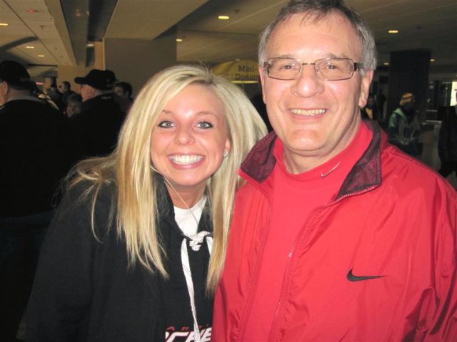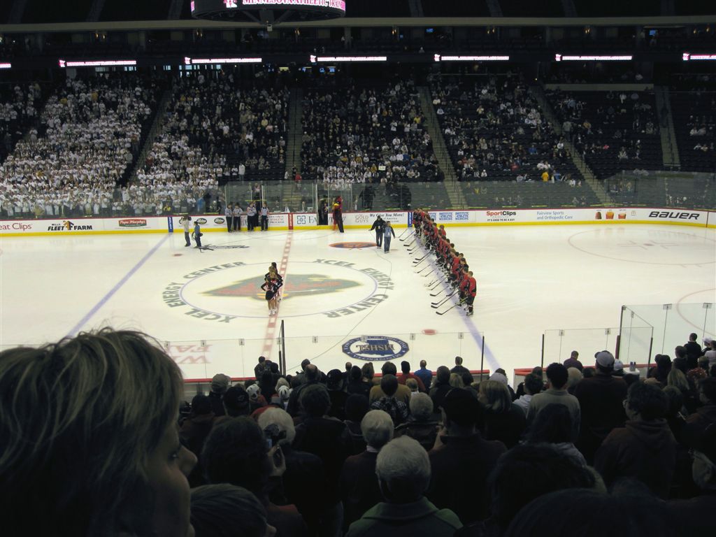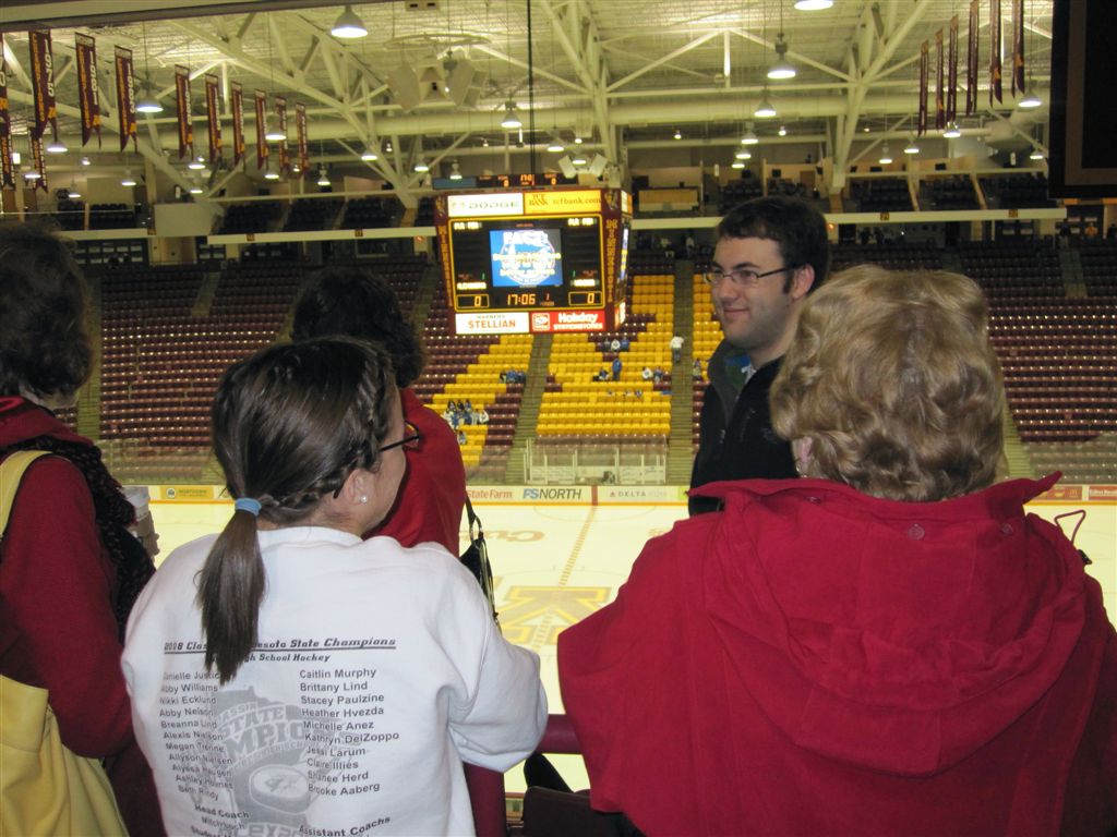 Entering the arena, our first game ever at Mariucci, the gold standard for men’s college hockey, we ran across our cheerleaders expressing their admiration for certain members of our team. Then we again ran into the family Williams – here Abby (wearing her state championship sweatshirt) and her older brother, James, discuss the finer points of backchecking with Vivian as the game was about to begin. The game began with the Cards hair on fire . . .