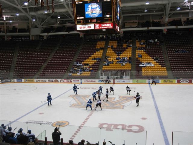 So, we headed out at oh-dark-thirty yesterday morning, in the fog and rain, for the consolation game at Mariucci Arena on the U of M campus. [Two weeks of beautiful, sunny, above-freezing weather followed by this week of rain has put a real dent in the snow cover. We now have exposed areas of grass in the yard for the first time since November.] Consolation games between two outstate teams on a Thursday morning don’t exactly pack the stands. Anyway, our Cards were taking on Virginia/Mountain Iron/Buhl in the 1st consolation game of the day. VMIB lost the previous day to highly regarded, and No. 3 seed (with a 25-3 record), Hermantown, by a very respectable 2-1 score – so we knew it would be a tough game.