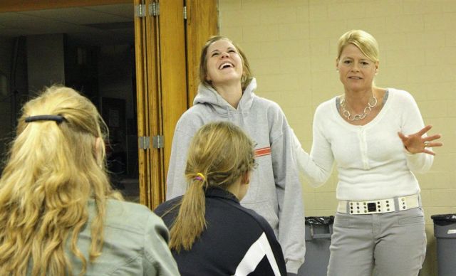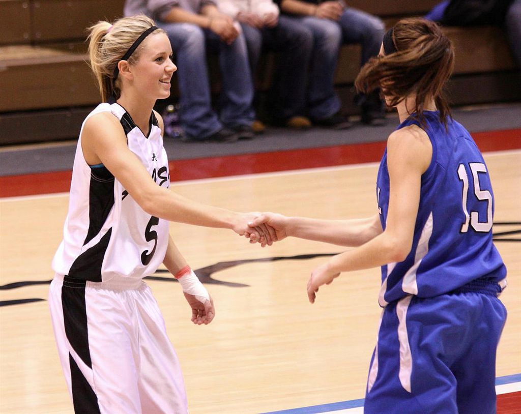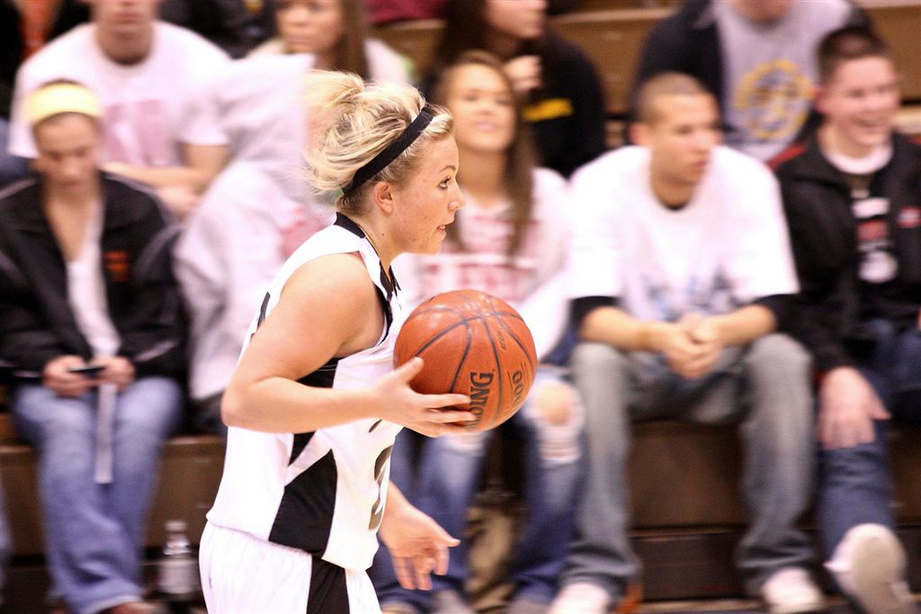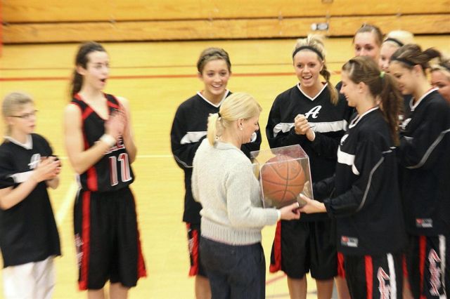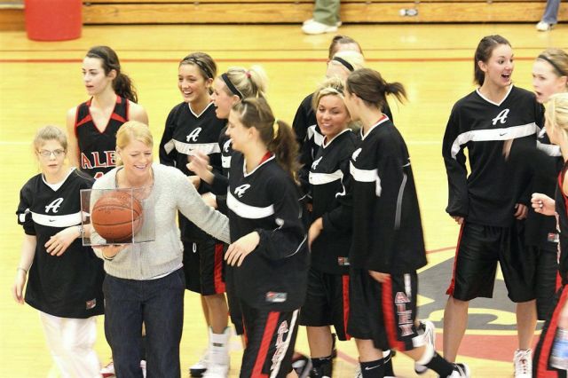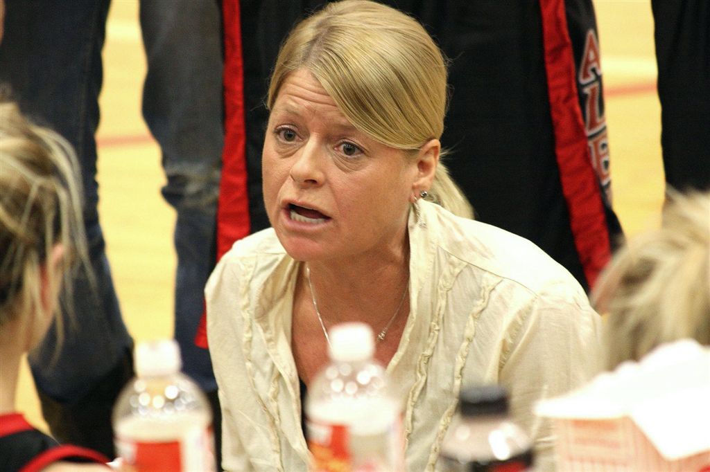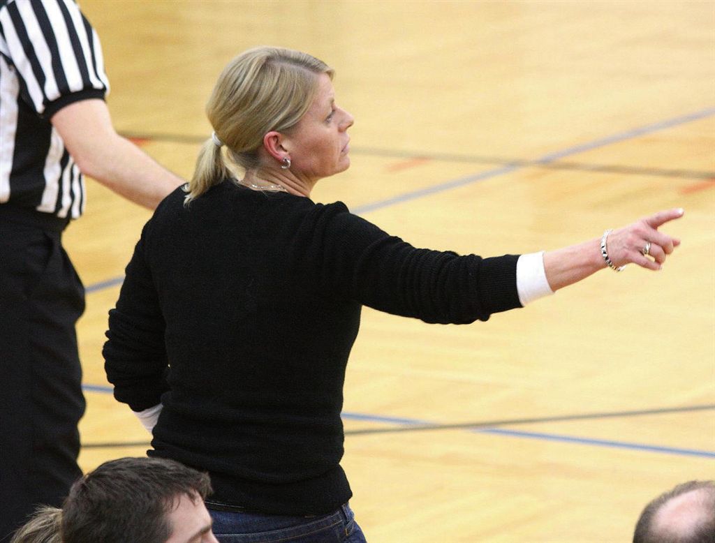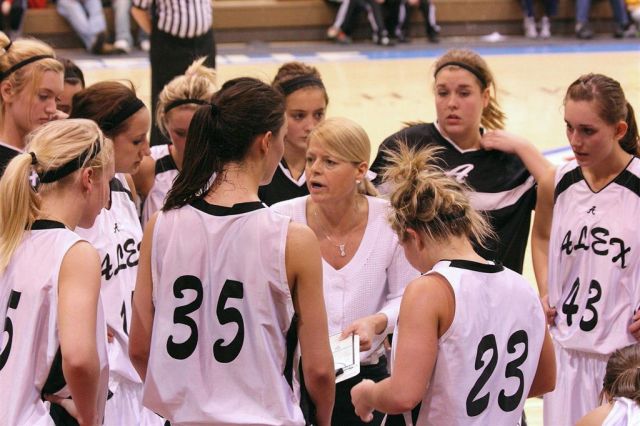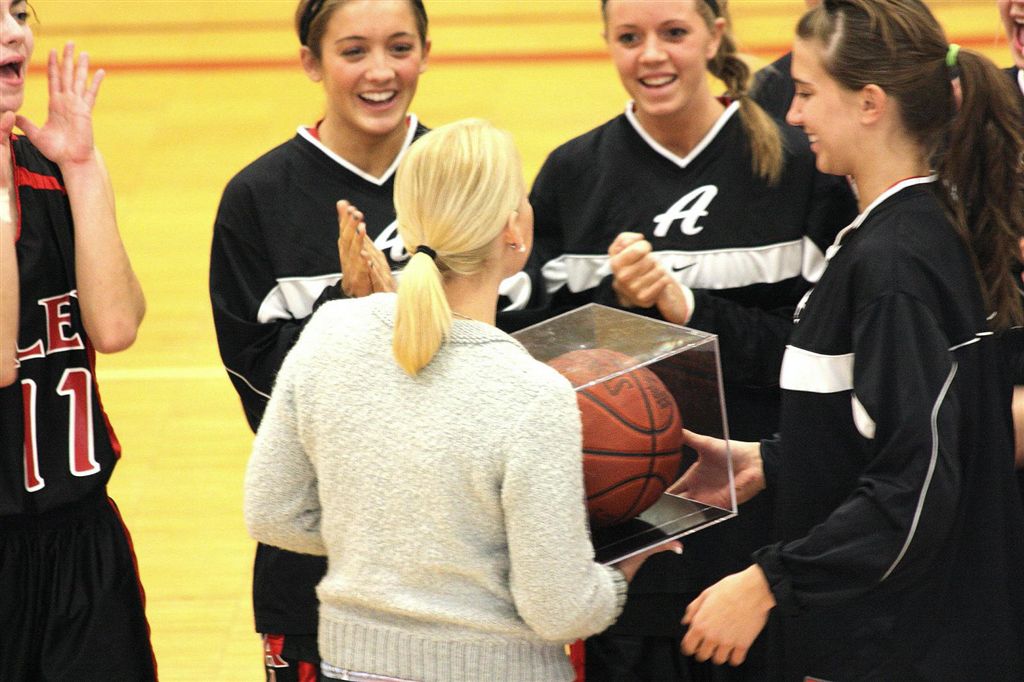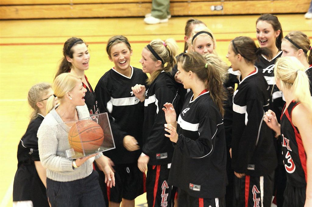 So, there were a lot of highlights. What to select for the lead-off issue? How about Wendy Kohler’s girls’ basketball season during which she got her 400th career win with the Cards (look out, Pat Summitt)! The attached photos of Coach Kohler’s season are courtesy of Greg and Val Trumm (thanks again to them). After years of great relationships with hockey moms (well, at least from my perspective), the Trumm’s introduce us to sports in which their daughters, Sam (volleyball, basketball) and Lauren (basketball, softball), participate. Both Sam and Lauren played on last year’s team – a team I thought was probably as athletic and entertaining as any in the state. But stuff happens. And although the team loses both starting guards and possibly the most talented basketball player ever to play for Alex, Sam and Lauren will be back and the Cards will be good again. [Editor’s note: Turns out to have been a great call! 🙂 ] But I get ahead of myself.