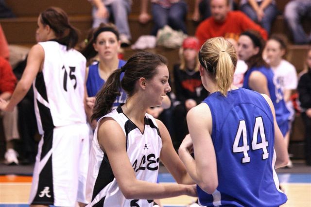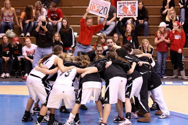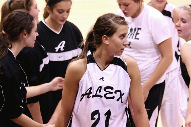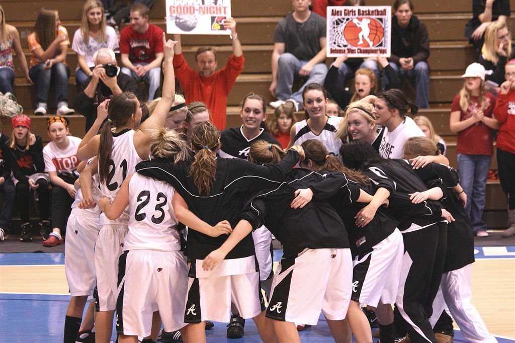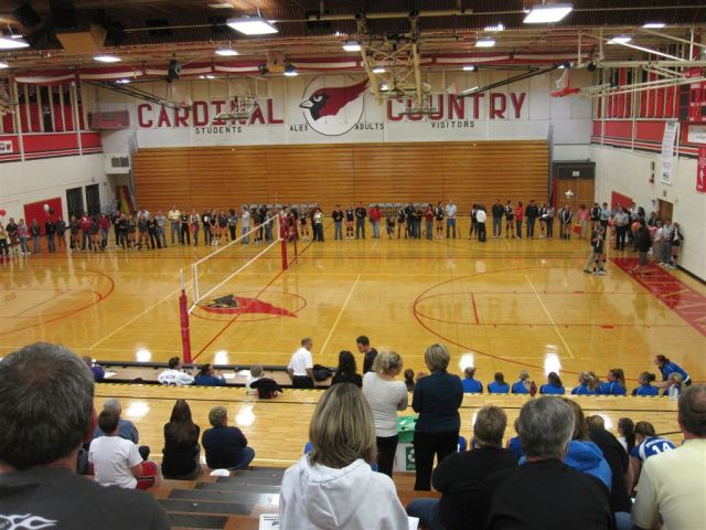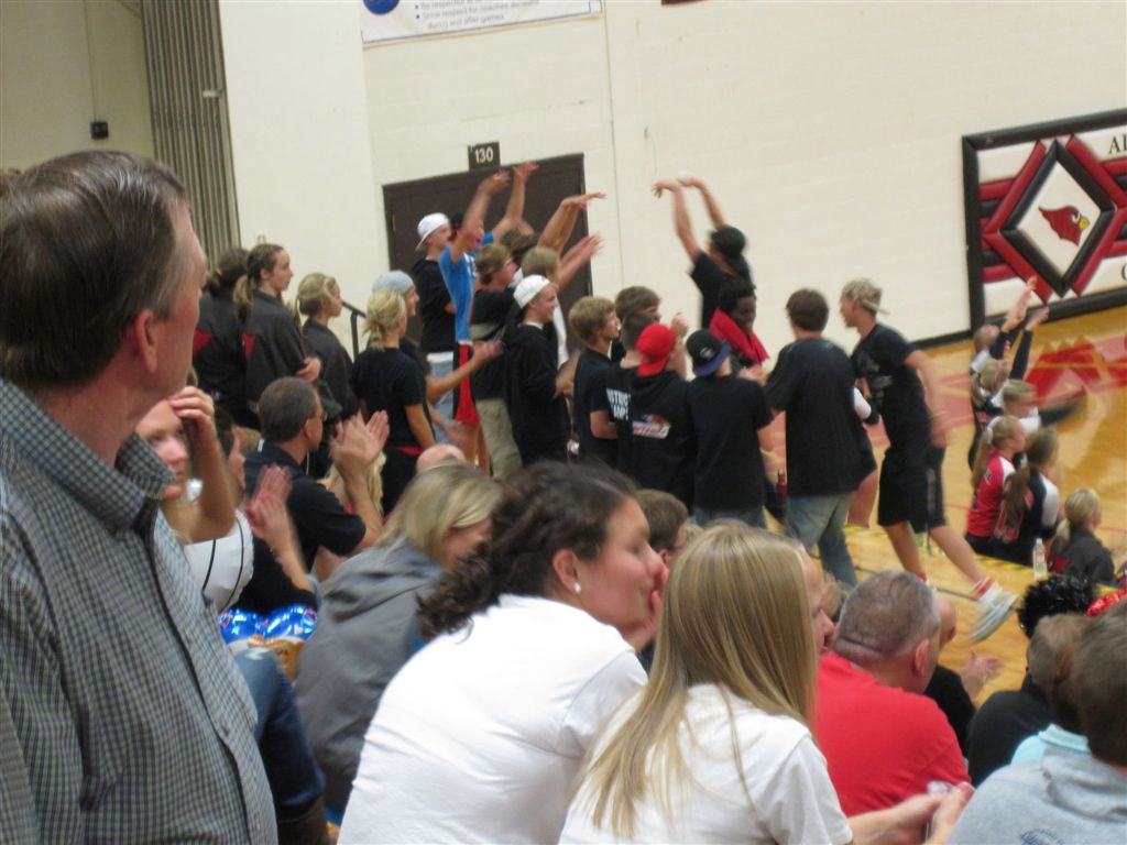 The Cardinals fell to the Sabres in overtime on Friday night at St. Johns University 62-64. What a heartbreaker to end such a successful season. The game was tied 7 times and the lead changed 12 times throughout the contest as the Cards bowed to the Sabres in OT. All week we focused on rebounding as the Sabres have pounded everyone on the boards and we won that category out rebounding them 45-27. We also forced the Sabres into 29 turnovers and scored a whopping 31 points off their turnovers. We had some key turnovers of our own that opened the door a crack for the Sabres to force OT where they eventually seized the win. It was a tough loss to swallow as at stake was a berth in the State Tournament. Scoring for the Cardinals was Angela Christianson with 27, Gracie Bruzek 11, Sam Trumm 9, Alli Haar and Lauren Trumm 6, and Kate Gearman 3. Haarsy led on the boards with 10, Sambo 8, AC 6, and 5 for Lauren Trumm, KG, and Woody. Gracie Bruzek dished out 6 assists and played on fantastic floor game pushing tempo and setting the offense for the Cards. Ang C. recorded 5 steals for the Cardinals. The game boiled down to shooting percentage as well as the Cards usually shoot much better but only shot 36% and the Sabres shot 52% from the field. It was a very fun season for the Cards and coaching staff as we finished 22-6 overall and won the CLC Championship with a 16-2 record in the Conference. The Cardinals will graduate 4 seniors that have put Alex Basketball back on the radar with their skills, hard work and dedication to the game and program. We thank them very much for everything and their parents as well. They are Allie Thul, Gracie Bruzek, Angela Christianson, and Kate Gearman. Special thanks to the band, cheerleaders, students, parents and all of the fans that have supported us all season with their attendance and encouragement everyday! What a fantastic crowd we had a St. Johns as well!