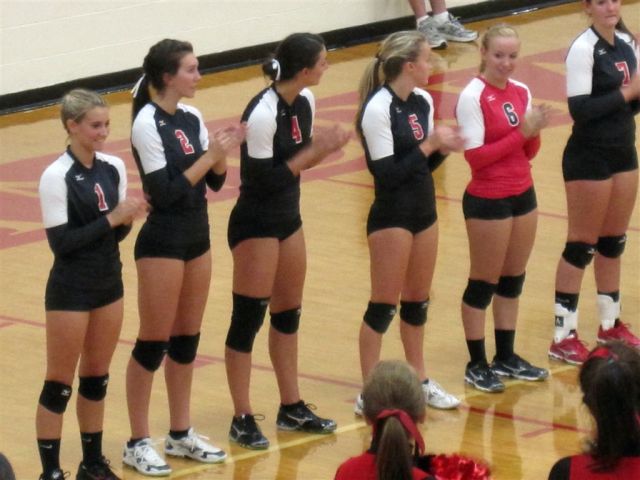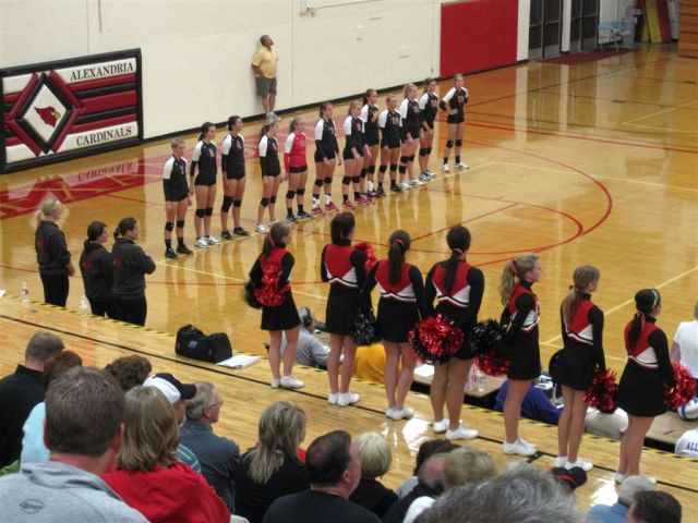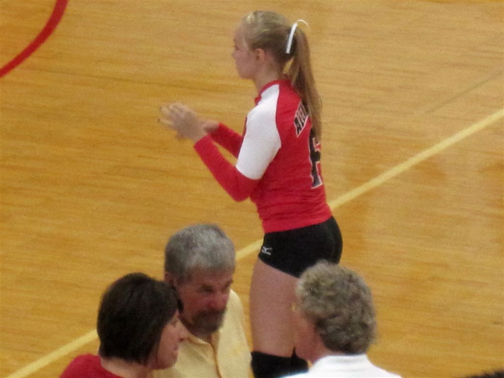 The game was a half hour late getting started – the JV1 game went long, plus the pre-game festivities. A big conference rivalry game v. the dreaded Brainerd Warriors. Because there were also JV1 and JV2 games, Brainerd had a large fan base of squeaky, high-pitched voices from the JV teams . . . and Roger and I were sitting right next to that (oy!). So, there was a continuous battle of which side (Alex high school boys, with girls’ basketball star, Ally Haar, right in the middle of them all – don’t know I missed her in that fan photo, she’s 6′ tall?) could make the most noise. We highlighted in the team photos captain Sam Trumm (No. 4) and libero Shanee’ Herd (No. 6) because we know their parents – I think all recognize Sam is our star player (in basketball as well), and Shanee’, though only a sophomore, has been playing on the varsity hockey team since she was a 7th-grader.