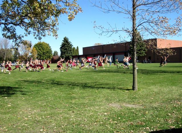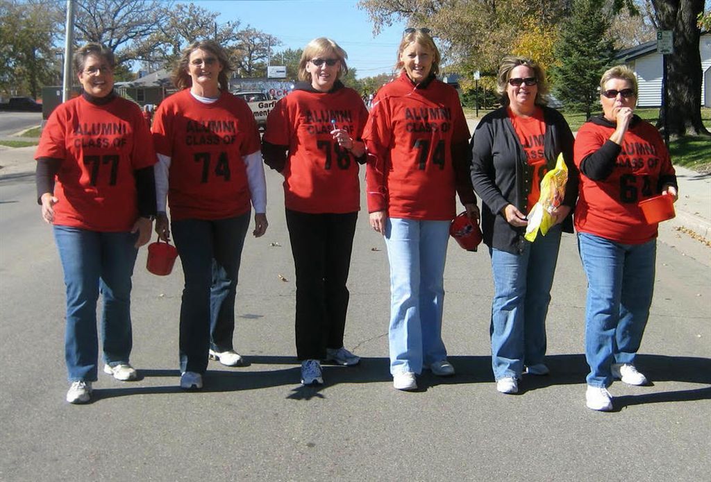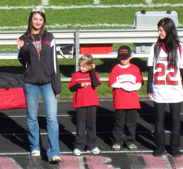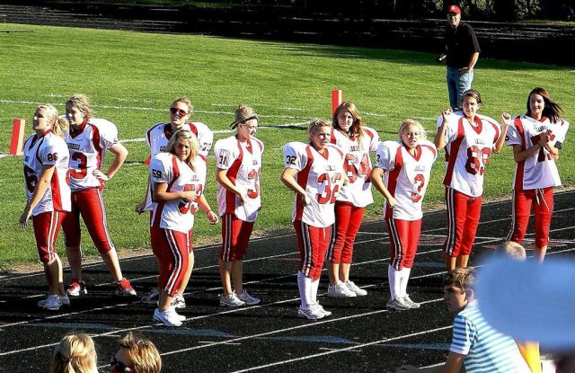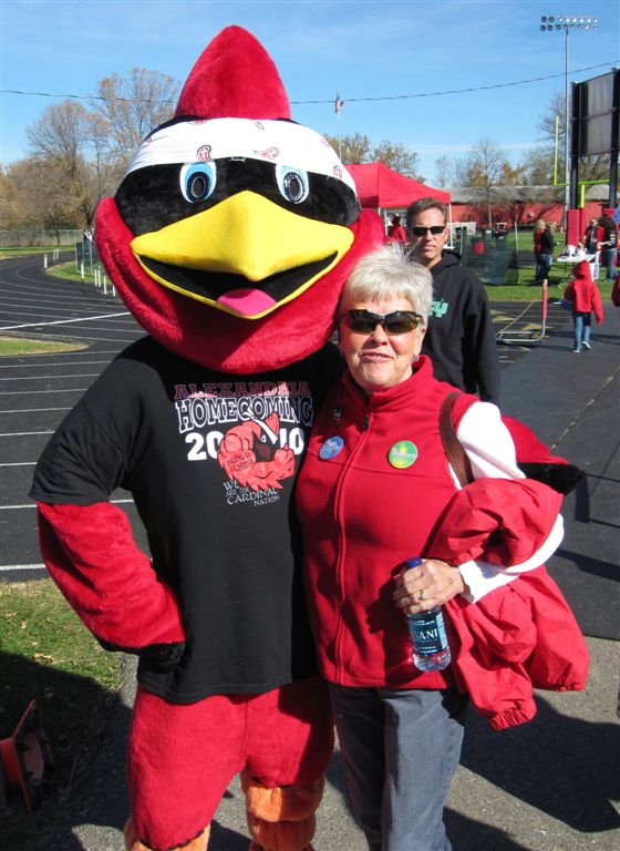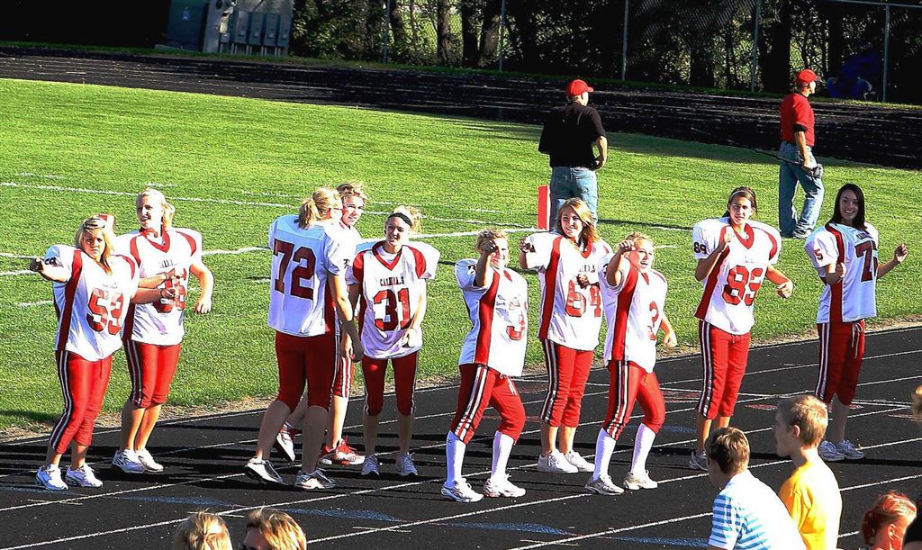 The volleyball team used to appear such for homecoming [photos courtesy of Greg Trumm, 1908] and aid and abet the cheerleaders during the game. They would lope around the field, as only volleyballers can lope, inspiring the assembled masses. They didn’t appear this year, or last year either, as I recall? [Editor’s note: The first time we experienced this, early in the last decade after moving to back to Alex, was before we had “discovered” girls sports. When they first appeared, I had no clue what was going on? Who were these exceptionally tall young women (they were a head taller than the cheerleaders)? Why were they wearing football uniforms? Someone finally explained they were the volleyball team. Volleyball team?]